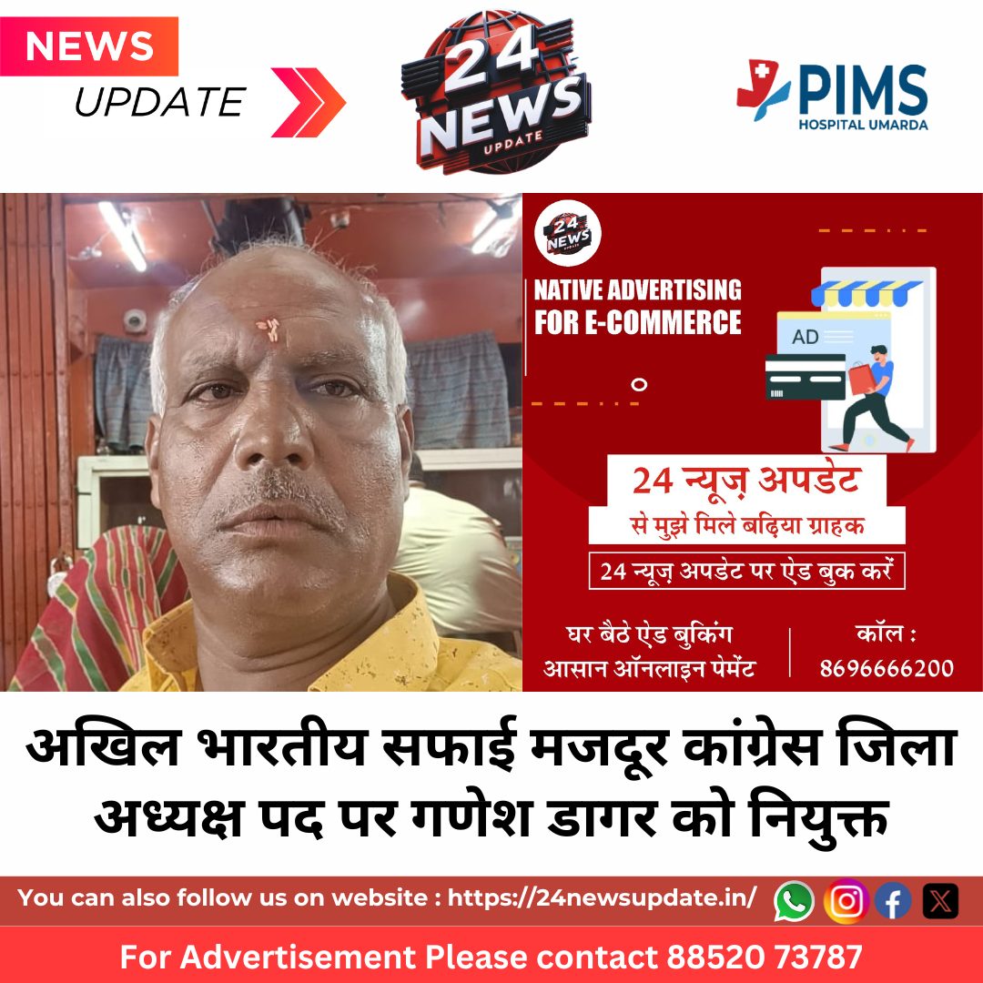 24 News Update निम्बाहेडा। अखिल भारतीय सफाई मजदूर कांग्रेस राष्ट्रीय अध्यक्ष राजेश बेनीवाल व प्रदेश अध्यक्ष किशन लाल जैदिया ने जिला अध्यक्ष पद पर गणेश डागर को नियुक्त किया गया है। यह नियुक्ति सत्र 2025 से 2027 तक के लिए की गई है।