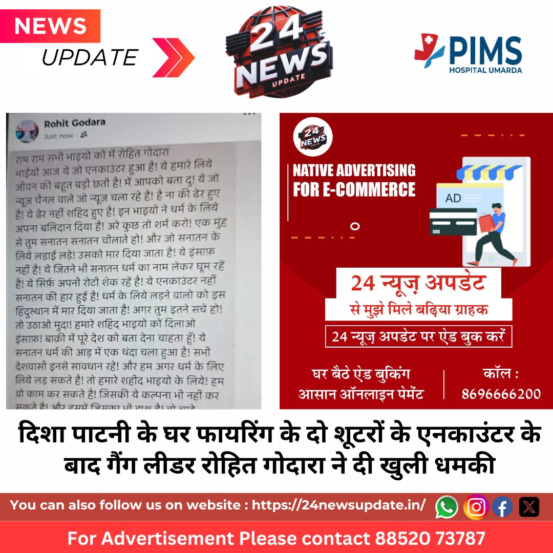 24 news Update बरेली / गाजियाबाद: बरेली में अभिनेत्री दिशा पाटनी के घर पर 11–12 सितंबर की दरम्यानी रात हुई फायरिंग के आरोपियों में शामिल बताए जा रहे दो शूटरों को बुधवार शाम एक संयुक्त पुलिस ऑपरेशन में मुठभेड़ में मार गिराया गया। इस घटना के बाद गैंगस्टर रोहित गोदारा ने सोशल मीडिया पर एक धमकीभरा पोस्ट किया है, जिसमें उन्होंने एनकाउंटर को घाटा बताया और बदला लेने की बात कही।