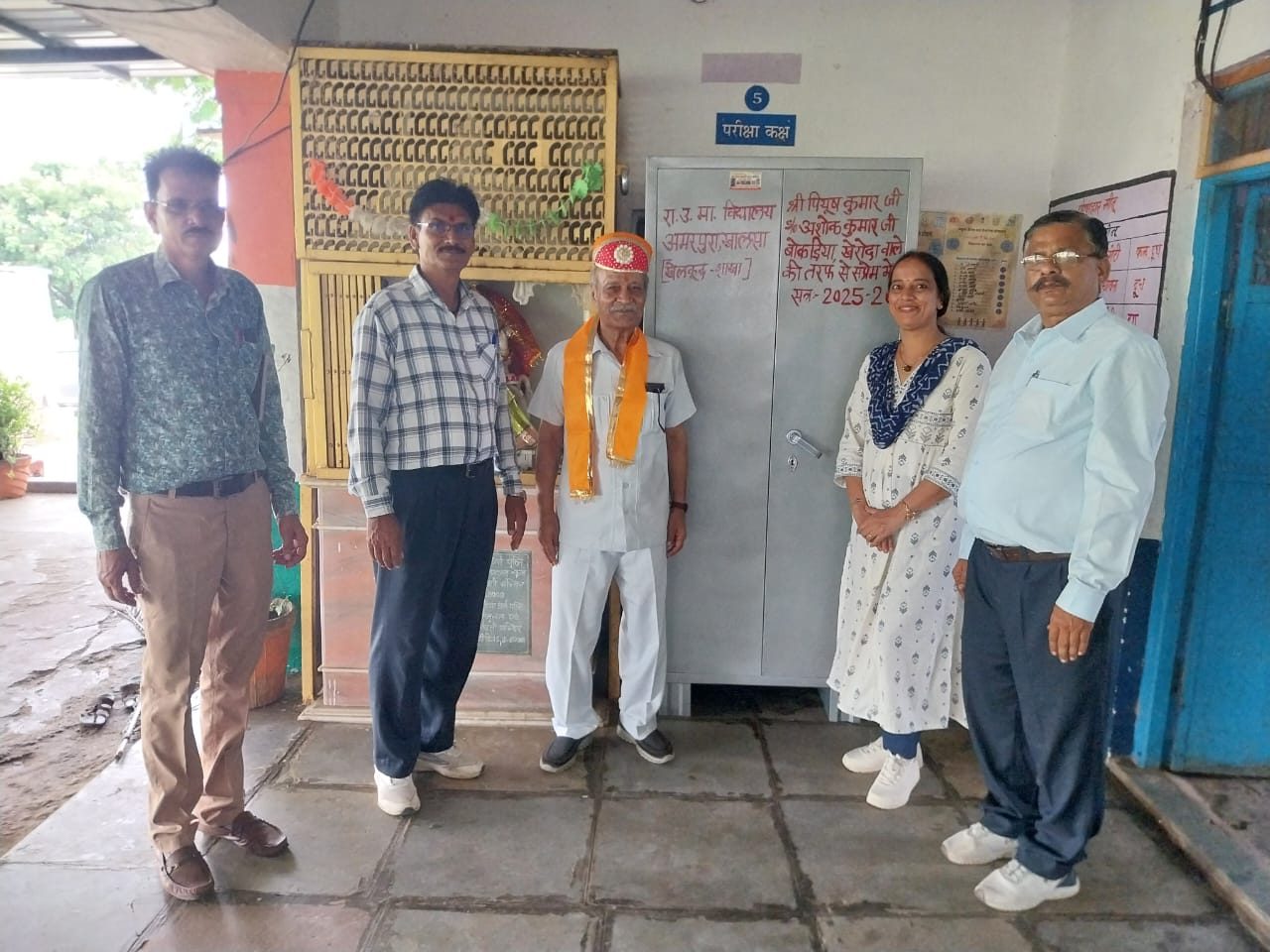 24 News update खेरोदा। राजकीय उच्च माध्यमिक विद्यालय अमरपुरा (खालसा) में खेरोदा निवासी पियूष कुमार बोकड़िया पुत्र श्री अशोक कुमार बोकड़िया द्वारा विद्यालय को एक बड़ी अलमारी भेंट की गई। यह सहयोग मदनलाल जी बोकड़िया की प्रेरणा से किया गया, जिनके सामाजिक योगदान के लिए क्षेत्र में विशेष सराहना की जाती है। विद्यालय की प्रधानाचार्या श्रीमती ममता दवे एवं समस्त स्टाफ की ओर से पियूष कुमार का हार्दिक स्वागत एवं आभार व्यक्त किया गया। इस अवसर पर स्टाफ सदस्य श्री गोवर्धन सिंह राठौड़, नानालाल मेनारिया, बंशीलाल पुष्करणा सहित अन्य शिक्षकगण उपस्थित रहे। विद्यालय प्रशासन ने इस प्रकार के सहयोग को विद्यार्थियों के हित में प्रेरणादायक बताया और समाज से ऐसे योगदान की निरंतर अपेक्षा जताई।