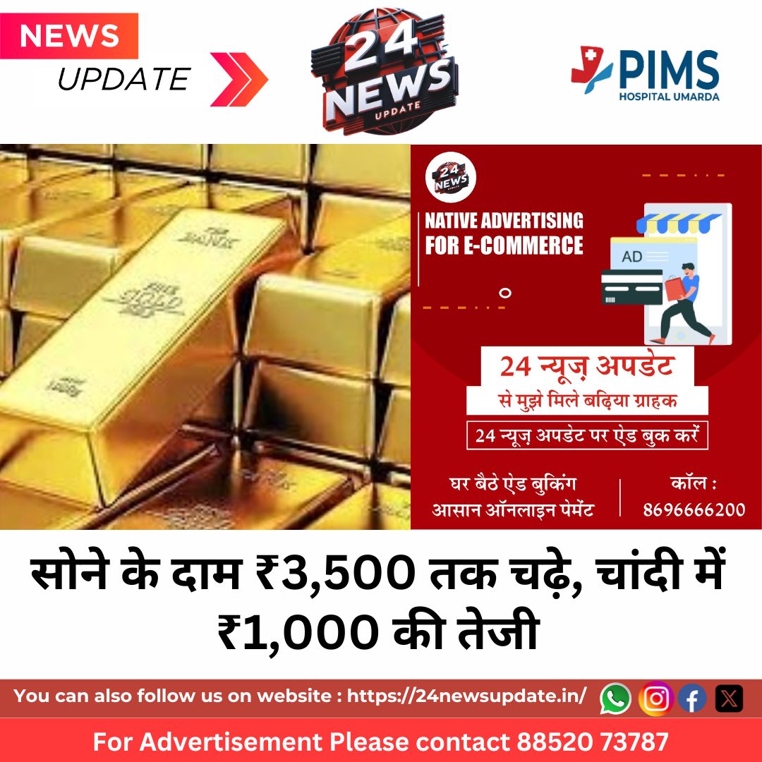 24 News Update उदयपुर । सर्राफा बाजार में पिछले चार दिनों में सोने और चांदी के दाम लगातार बढ़े हैं। सर्राफा एसोसिएशन के अनुसार सोना स्टैंडर्ड (999) 5 सितम्बर को ₹1,09,500 प्रति 10 ग्राम था, जो 9 सितम्बर को बढ़कर ₹1,13,000 हो गया। इस तरह चार दिनों में सोने के दाम में ₹3,500 प्रति 10 ग्राम की तेजी दर्ज हुई। इसी तरह, सोना जेवराती (23 कैरेट) ₹1,05,120 से बढ़कर ₹1,08,480 और सोना 22 कैरेट ₹1,00,740 से बढ़कर ₹1,03,960 पर पहुंच गया। चांदी टंच का भाव भी 5 सितम्बर को ₹1,27,400 प्रति किलो से बढ़कर 9 सितम्बर को ₹1,28,400 प्रति किलो हो गया, यानी ₹1,000 प्रति किलो की बढ़त। चांदी चौरसा ₹1,26,500 से बढ़कर ₹1,27,500 प्रति किलो पर पहुंची। सर्राफा बाजार के जानकारों का कहना है कि अंतरराष्ट्रीय बाजार में निवेशकों की बढ़ती खरीद और आर्थिक अनिश्चितता के कारण सोने-चांदी के दामों में यह तेजी देखी जा रही है।