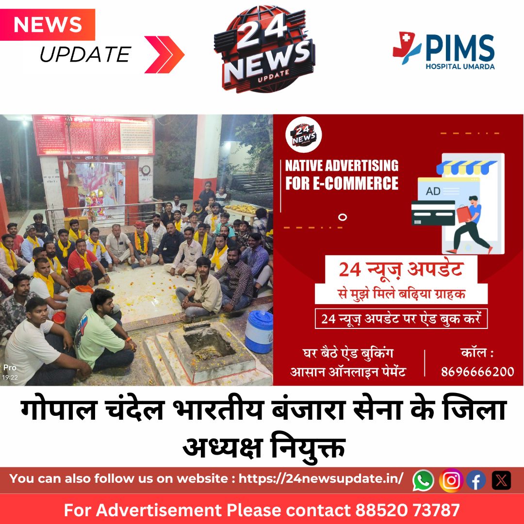 24 News Udpate निंबाहेड़ा कविता पारख। भारतीय बंजारा सेना के प्रदेश अध्यक्ष भारत दायमा ने निंबाहेड़ा निवासी गोपाल चंदेल को भारतीय बंजारा सेना के चितौड़गढ़ जिला अध्यक्ष पद पर नियुक्त किया। प्रदेश अध्यक्ष दायमा ने चंदेल को बंजारा सेना के जिला अध्यक्ष पद पर नियुक्त करते हुए आशा की कि नवनियुक्त जिला अध्यक्ष चंदेल अपने क्षेत्र के बंजारा भाइयों को जागरूक करते हुए और उनकी समस्याओं के समाधान हेतु निरंतर प्रयास करते हुए भारतीय बंजारा सेना की लोकप्रियता समाज में बनाए रखते हुए बंजारा सेना के राष्ट्रीय अध्यक्ष नेमचंद सिंह के सपनों को साकार करने हेतु प्रयत्नशील रहेंगे। इस अवसर पर नवनियुक्त जिला अध्यक्ष चंदेल की इस नियुक्ति पर उनके समर्थकों द्वारा आदर्श कॉलोनी से उनका स्वागत करते हुए जुलूस प्रारंभ किया जो कि इश्क्काबाद,अटल नगर,जेके चौराहा होते हुए बंजारा बस्ती स्थित मोड़ के बालाजी मंदिर पर पहुंच कर समाप्त हुआ। जहां पर एक साधारण सभा आयोजित कर संगठन को आगे बढ़ाने की बात पर विचार विमर्श किया गया। इस अवसर पर बड़ी संख्या में बंजारा समाज से जुड़े समाजजन उपस्थित रहे। Share this: Share on X (Opens in new window) X Share on Facebook (Opens in new window) Facebook More Email a link to a friend (Opens in new window) Email Share on WhatsApp (Opens in new window) WhatsApp Like this:Like Loading... Related Discover more from 24 News Update Subscribe to get the latest posts sent to your email. Type your email… Subscribe Post navigation राठौड़ को मिला गैलेंट्री प्रमोशन, हेड कांस्टेबल से अब बने सहायक उप निरीक्षक जिले की फुटबॉल प्रतिभाओं को आगे अवसर प्रदान करवाने हेतु हर संभव प्रयास किए जाएंगे—पूरण आंजना