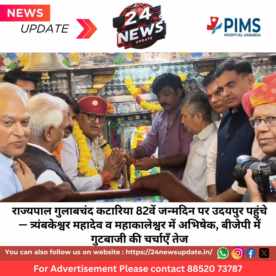 24 News Update उदयपुर। पंजाब के राज्यपाल और चंडीगढ़ के प्रशासक गुलाबचंद कटारिया सोमवार को अपने 82वें जन्मदिन के अवसर पर दो दिवसीय प्रवास पर उदयपुर पहुंचे। शहर पहुंचने के बाद उन्होंने माछला मगरा स्थित त्र्यंबकेश्वर महादेव और महाकालेश्वर मंदिर में अभिषेक कर प्रदेश व देश की खुशहाली की कामना की।