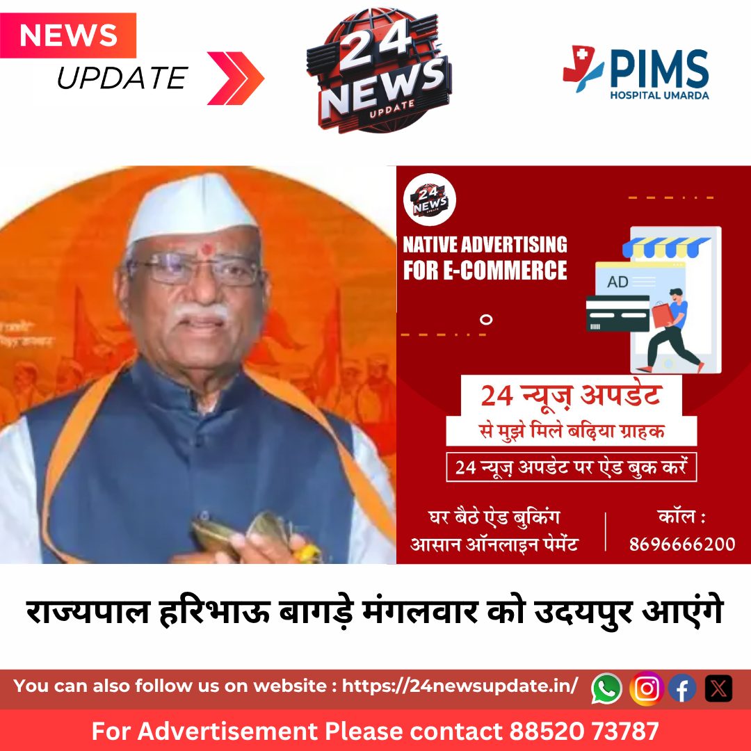 24 News Update उदयपुर, 27 अक्टूबर। राज्यपाल श्री हरिभाऊ किसनराव बागड़े मंगलवार को सायं 5ः15 बजे वायुयान द्वारा उदयपुर आएंगे। जारी कार्यक्रम के अनुसार राज्यपाल श्री बागड़े मंगलवार शाम विमान से डबोक एयरपोर्ट पहुंचेगें यहां से सड़क मार्ग द्वारा पद्मपत सिंधानिया विश्वविद्यालय, भटेवर के लिए प्रस्थान करेंगे। विश्वविद्यालय में आयोजित कार्यक्रम में भाग लेने के पश्चात श्री बागड़े चित्तौड़गढ़ के लिए प्रस्थान करेंगे। राज्यपाल श्री बागड़े 29 एवं 30 अक्टूबर को चित्तौड़गढ़ और कोटा प्रवास पर रहेंगे। 30 अक्टूबर को रात्रि 8ः40 बजे सड़क मार्ग द्वारा महाराणा प्रताप एयरपोर्ट, डबोक आकर 8ः45 बजे वायुयान द्वारा जयपुर के लिए प्रस्थान करेंगे।