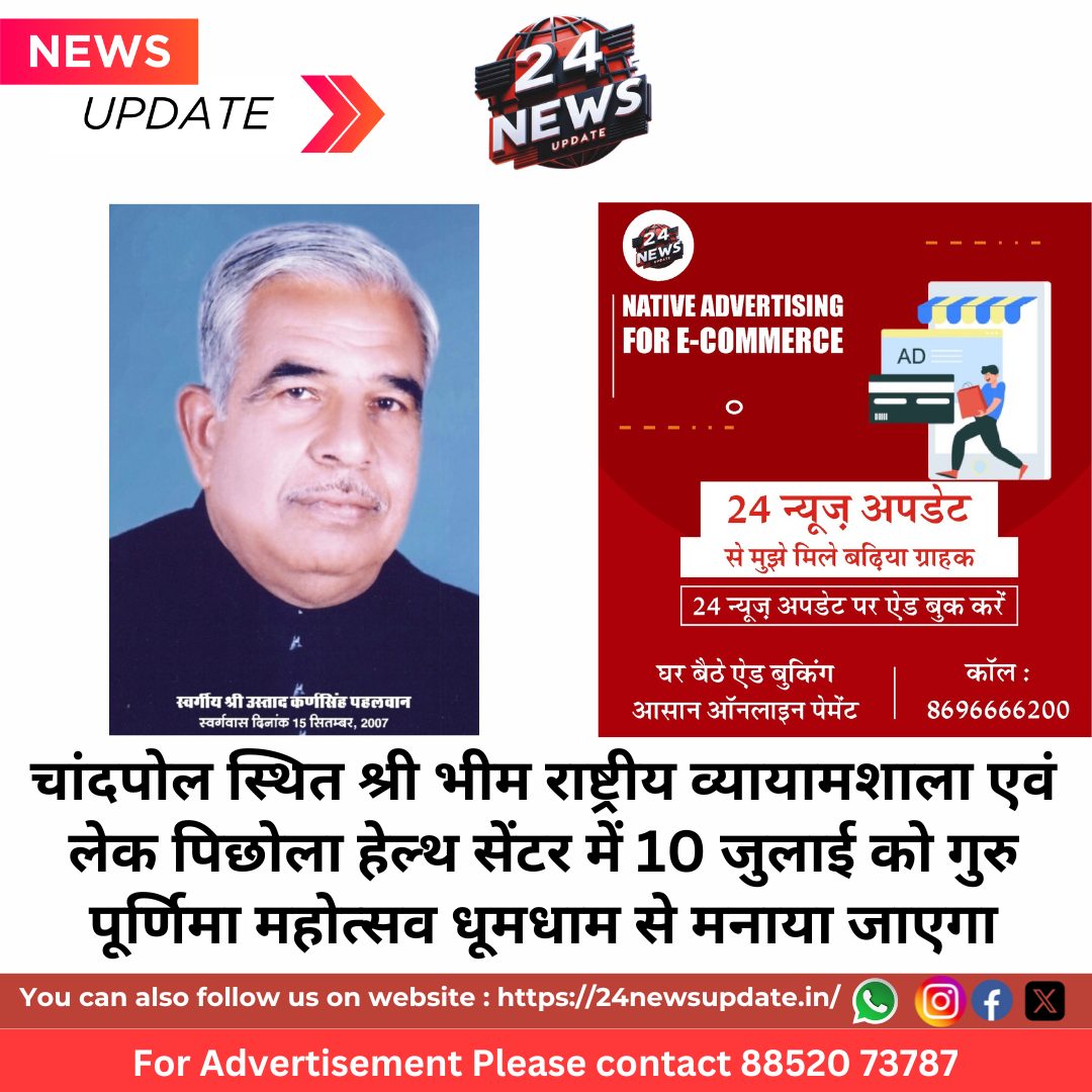 24 News Update उदयपुर। गुरु पूर्णिमा के पावन अवसर पर 10 जुलाई को चांदपोल स्थित श्री भीम राष्ट्रीय व्यायामशाला एवं लेक पिछोला हेल्थ सेंटर में गुरु महोत्सव पूरे श्रद्धा व उत्साह के साथ मनाया जाएगा। इस अवसर पर व्यायामशाला एवं हेल्थ सेंटर के सभी शिष्य अपने संस्थापक पूज्य उस्ताद कर्ण सिंह पहलवान को नमन करते हुए उनकी चरण पादुका की पूजा अर्चना करेंगे। तत्पश्चात उस्ताद की तस्वीर पर पुष्पांजलि अर्पित की जाएगी।