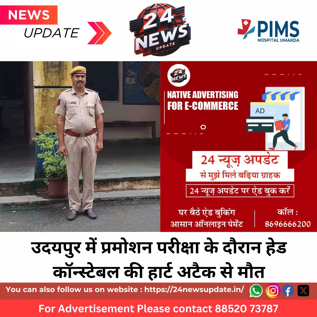 24 News Update उदयपुर। उदयपुर में पुलिस विभाग की प्रमोशन प्रक्रिया के दौरान दर्दनाक हादसा हो गया। फिजिकल टेस्ट के दौरान हेड कॉन्स्टेबल जब्बर सिंह (42) की हार्ट अटैक से मौत हो गई। जानकारी के अनुसार, पुलिस लाइन में एएसआई प्रमोशन के लिए आयोजित दौड़ के दौरान जब्बर सिंह अचानक बेहोश होकर गिर पड़े। साथी पुलिसकर्मियों ने तुरंत उन्हें एमबी अस्पताल पहुंचाया, जहां डॉक्टरों ने उन्हें मृत घोषित कर दिया।