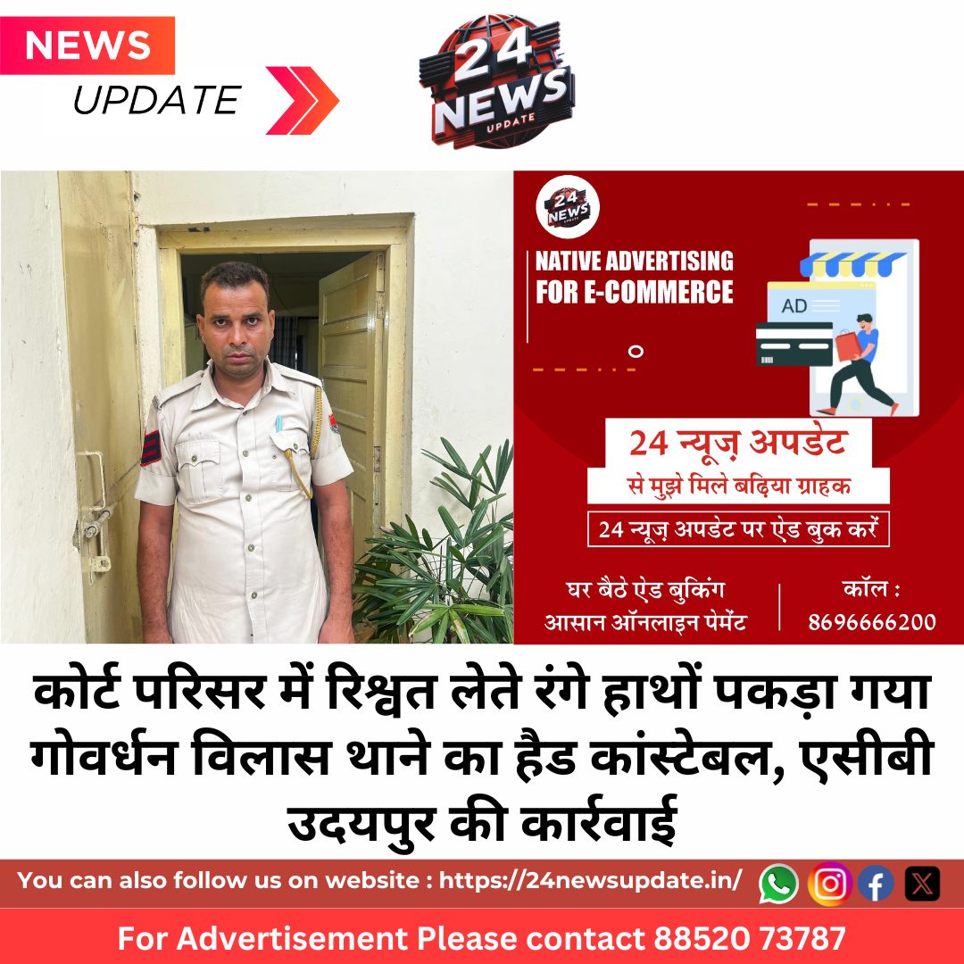 24 News Update उदयपुर. भ्रष्टाचार निरोधक ब्यूरो (एसीबी) उदयपुर ने सोमवार को एक बड़ी कार्रवाई करते हुए गोवर्धन विलास थाने में पदस्थापित हैड कांस्टेबल संजय कुमार मीणा को कोर्ट परिसर, उदयपुर से रिश्वत लेते हुए रंगे हाथों गिरफ्तार किया। आरोपी पुलिसकर्मी ने एक बंदी की पत्नी से मारपीट नहीं करने और समय पर पेश कर जमानत में सहयोग करने की एवज में रिश्वत मांगी थी।
