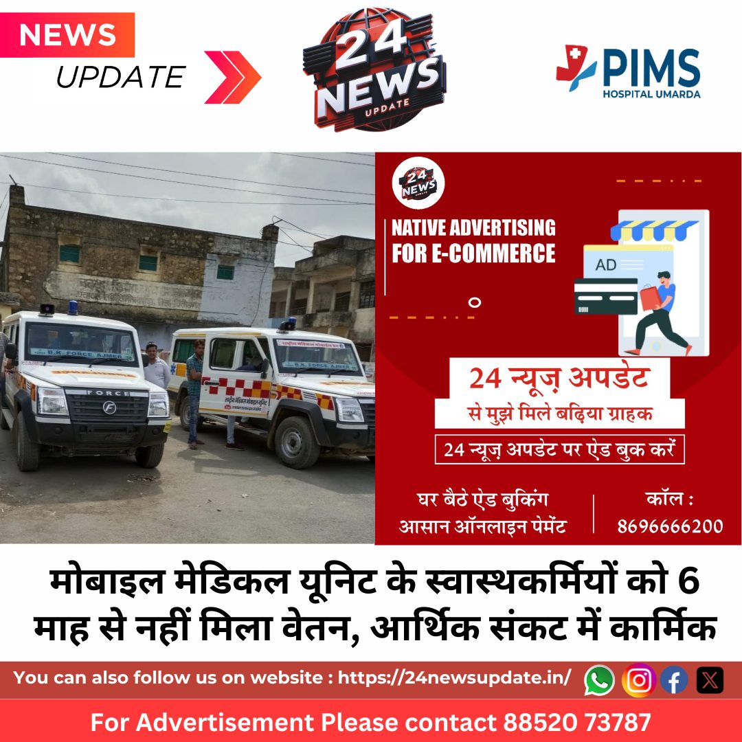 24 News Update निम्बाहेड़ा कविता पारख। जिले के समस्त ग्रामीण क्षेत्रों में चिकित्सा सेवाएं उपलब्ध करवाने लिए मोबाइल मेडिकल यूनिट संचालित है। स्वास्थ्य विभाग द्वारा संचालित मोबाइल मेडिकल यूनिट जिले के समस्त ग्रामीण क्षेत्रों में निःशुल्क चिकित्सा परामर्श, जांच और इवाईयां उपलब्ध कराने का काम करती है। लेकिन स्वास्थ्य विभाग के अधीन संचालित मोबाइल मेडिकल यूनिट के ठेकाकार्मिकों को 6 माह से भुगतान नहीं मिल पाया है। जिसके चलते यह कार्मिक आर्थिक संकट में आ गए है।