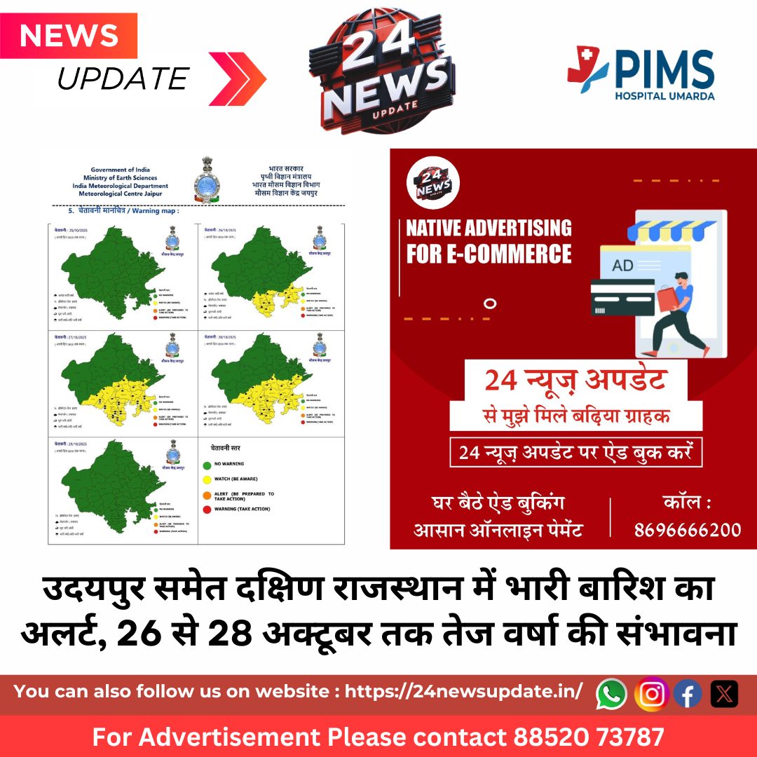 24 News Update जयपुर। भारत मौसम विज्ञान विभाग (IMD) जयपुर केंद्र ने चेतावनी जारी की है कि उदयपुर सहित दक्षिण और पूर्वी राजस्थान के कई जिलों में अगले तीन दिनों तक गरज-चमक और भारी बारिश होने की संभावना है। विभाग के अनुसार, 27 अक्टूबर से एक नया पश्चिमी विक्षोभ उत्तर-पश्चिम भारत में सक्रिय होगा, जिससे मौसम में बड़ा बदलाव देखने को मिलेगा।