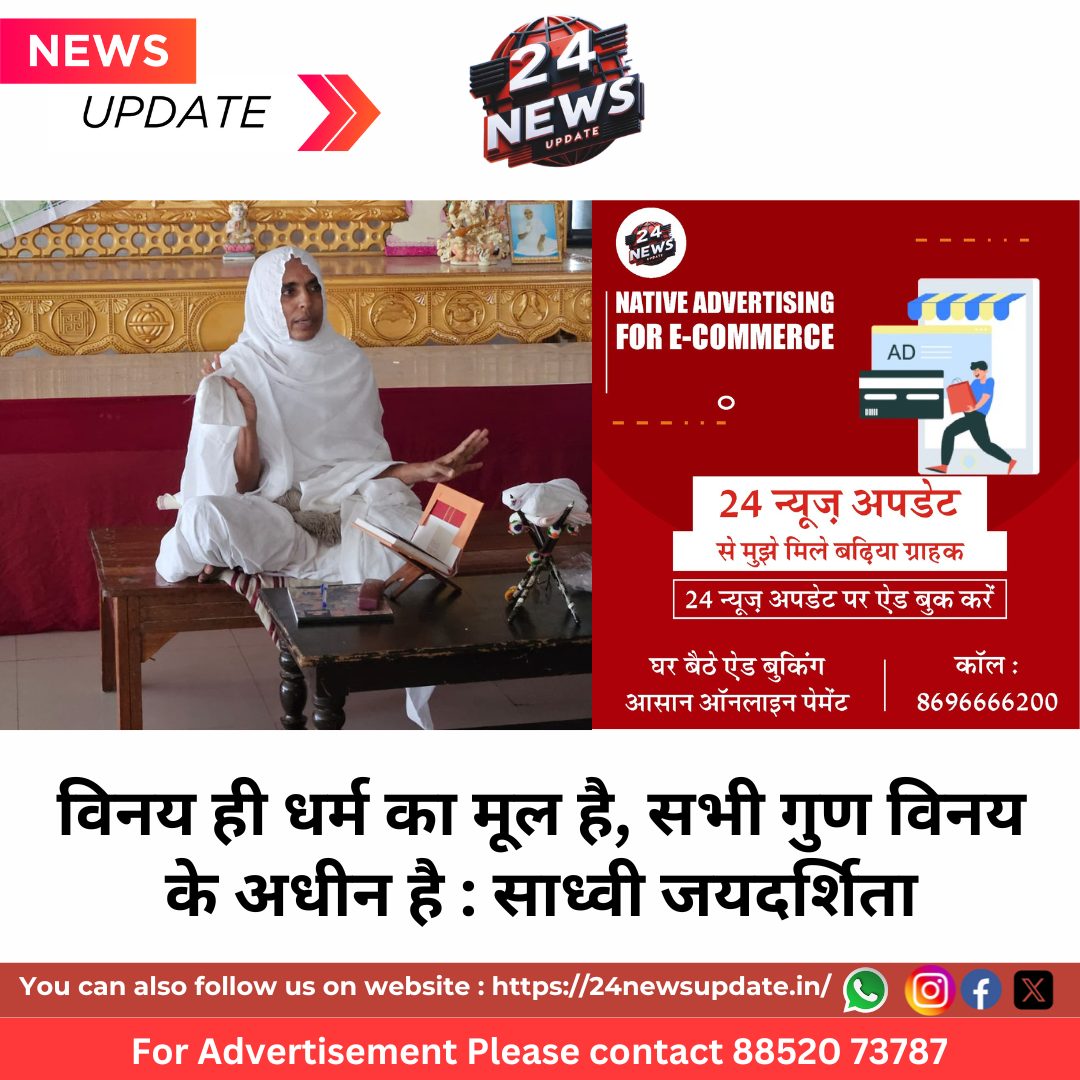 इस दौरान आयोजित धर्मसभा में साध्वी जयदर्शिता श्रीजी ने प्रवचन में बताया कि “किं मूलं धम्मे” धर्म का मूल क्या है यह प्रश्न परमात्मा महावीर से थावच्चा पूत्र ने पूछा – परमात्मा ने फरमाया कि “विनय मूले धम्मो” विनय ही धर्म का मूल है। सभी गुण विनय के अधीन है, यदि तुमने विनय को पा लिया है तो समस्त गुण पा लिये। विनय तो अंक है बाकी सब शून्य है। शून्य की अंक के बिना कोई कीमत नहीं। सद्गुणों के खजाने की यदि कोई चाबी है तो वह है विनय । आगे उन्होंने बताया कि ज्ञान पथ पर बढ़ने के लिए पहला कदम विनय ही है। क्योंकि विनम्रता के बिना पात्र नहीं बन सकते। विनम्रता के बिना कुछ पा नही सकते। हमारे जीवन में विनय, नमुता आयेगी तभी हम अपने लक्ष्य तक पहुँच सकते है।