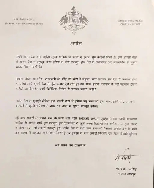 पूर्व नरेश की अपीलपूर्व नरेश गजसिंह ने भी शहरवासियों से अपनी जन्मभूमि की सुरक्षा के लिए सतर्क रहने और प्रशासन द्वारा जारी निर्देशों का पालन करने का आग्रह किया है। उन्होंने मायड़ भाषा में अपनी अपील में लिखा – ‘जलमभौम री सुरक्षा खातर तैयार रेवणौ है…’