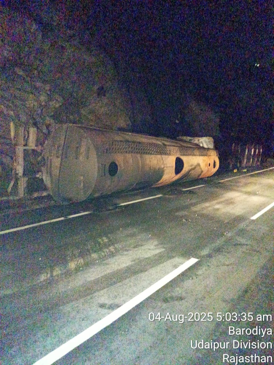 24 News Update उदयपुर। उदयपुर जिले के गोगुंदा-पिंडवाड़ा राष्ट्रीय राजमार्ग-27 पर सोमवार सुबह एक भीषण और दर्दनाक सड़क हादसे में एक व्यक्ति की जिंदा जलकर मौत हो गई। हादसा घसियार के पास उस वक्त हुआ जब गोगुंदा से उदयपुर की ओर जा रहा एसिड से भरा टैंकर अनियंत्रित होकर पलट गया और करीब 300 मीटर तक घसीटता हुआ चला गया, जिससे उसमें भीषण आग लग गई। टैंकर पलटने के साथ ही सड़क पर तेजाब फैल गया और वाहन में जोरदार धमाका हुआ। देखते ही देखते टैंकर आग की भीषण लपटों में घिर गया। लपटें इतनी विकराल थीं कि टैंकर का रजिस्ट्रेशन नंबर तक जलकर मिट गया और चालक की पहचान भी अब तक नहीं हो सकी है। चालक की मौके पर ही जलकर मौत हो गई।