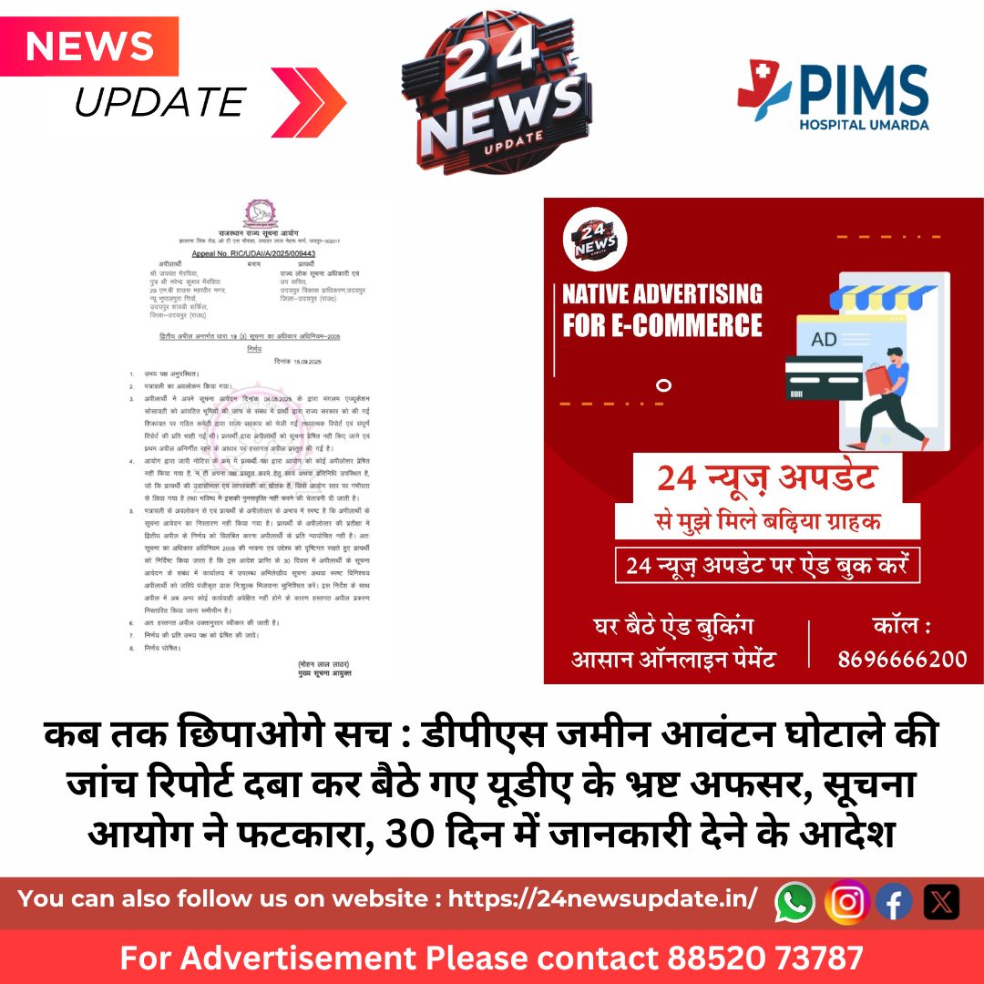 24 News Update उदयपुर। उदयपुर विकास प्राधिकरण (यूडीए) द्वारा डीपीएस स्कूल की जमीन से जुड़े आवंटन शर्तों और अनियमितताओं पर बनी जांच रिपोर्ट शिकायतकर्ता से छिपाने का मामला गंभीर मोड़ पर पहुंच गया है। राज्य सूचना आयोग ने प्राधिकरण को फटकार लगाते हुए आदेश दिया है कि पूरी रिपोर्ट 30 दिन के भीतर आवेदक को उपलब्ध कराई जाए।