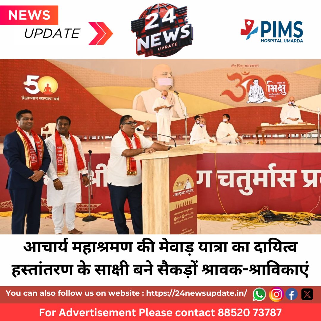 24 News Update उदयपुर, 5 नवम्बर। तेरापंथ धर्मसंघ के एकादशम अधिशास्ता आचार्य महाश्रमण अहमदाबाद चातुर्मास संपन्न कर मेवाड़ की और विहार करेंगे। इस दृष्टि से अहमदाबाद चातुर्मास व्यवस्था समिति द्वारा आगामी मेवाड़ यात्रा हेतु ध्वज और दायित्व हस्तांतरण का कार्यक्रम आचार्य महाश्रमण के सानिध्य में कोबा अहमदाबाद स्थित प्रेक्षा विश्व भारती में आयोजित हुआ। सैकड़ों श्रावक श्राविकाओं की साक्षी में अहमदाबाद चातुर्मास व्यवस्था समिति के अध्यक्ष अरविंद संचेती और उनकी टीम ने मेवाड़ कांफ्रेंस अध्यक्ष राजकुमार फत्तावत और टीम को एक माह की यात्रा का ध्वज प्रदान कर दायित्व हस्तांतरित किया।