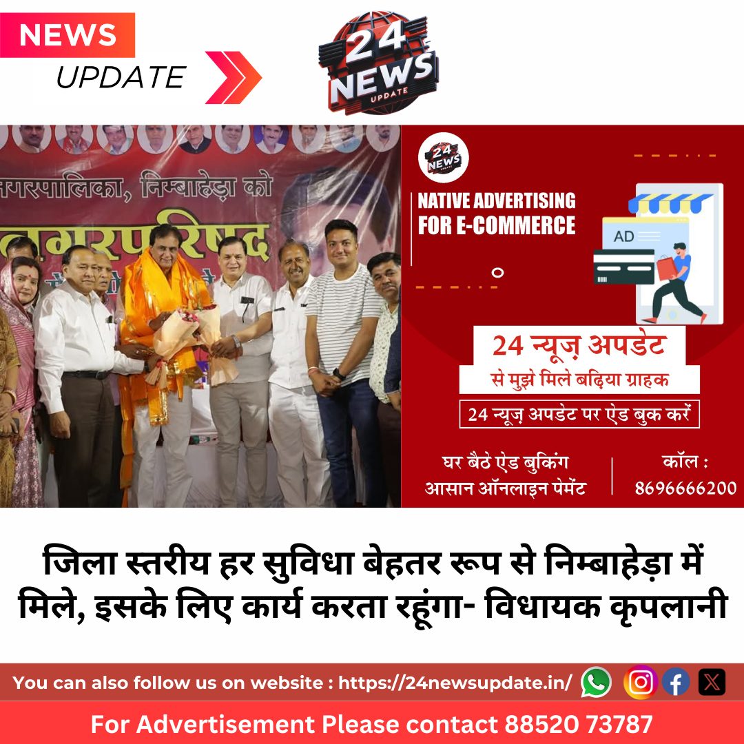 विधायक कृपलानी का विभिन्न सरकारी एवं सामाजिक संस्थाओं ने किया भव्य स्वागत वण्डर चौराहे से नगर पालिका तक निकली स्वागत रैली का जगह-जगह हुआ स्वागत कविता पारख 24 news update निम्बाहेड़ा। राजस्थान सरकार के मात्र सवा साल के कार्यकाल में ही निम्बाहेड़ा विधानसभा क्षेत्र को मिली सौगातों में विशेषकर नगर पालिका निम्बाहेड़ा को नगर परिषद में क्रमोन्नत करने जैसी महत्वपूर्ण घोषणा के पश्चात पहली बार निम्बाहेड़ा आगमन पर पूर्व स्वायत्त शासन मंत्री एवं विधायक श्रीचंद कृपलानी का विधानसभा क्षेत्र के भाजपा पदाधिकारियों एवं कार्यकर्ताओं के साथ ही नगर की विभिन्न सामाजिक एवं सरकारी संस्थाओं के द्वारा भव्य स्वागत किया गया।विधायक कृपलानी के जयपुर से सड़क मार्ग द्वारा निम्बाहेड़ा पहुंचने पर मांगरोल एवं वण्डर चौराहे पर सैकड़ों भाजपा पदाधिकारियों एवं कार्यकर्ताओं के साथ ही नगरवासियों ने भव्य आतिशबाजी कर स्वागत किया। इस दौरान वण्डर चौराहे से नगर पालिका कार्यालय तक स्वागत रैली निकाली गई, जिसका जे के तिराहे, अहिंसा सर्किल, शेखावत सर्कल आदि क्षेत्रों में नगर एवं आस-पास के ग्रामीण क्षेत्रों से आए क्षेत्रवासियों ने विधायक कृपलानी का स्वागत किया। जिला स्तरीय हर सुविधा बेहतर रूप से निम्बाहेड़ा में मिले, इसके लिए कार्य करता रहूंगा- विधायक कृपलानी नगर पालिका कार्यालय के बाहर आयोजित मुख्य स्वागत समारोह को सम्बोधित करते हुए विधायक कृपलानी ने सर्वप्रथम समस्त क्षेत्रवासियों को बजट में निम्बाहेड़ा वासियों को मिली सौगातों के लिए बधाई देते हुए कहा कि राज्य के यशस्वी मुख्यमंत्री भजनलाल शर्मा के नेतृत्व में मात्र सवा साल के कार्यकाल में ही निम्बाहेड़ा विधानसभा क्षेत्र को कई बड़ी सौगातें मिली है, जो जिसकी सूचि आने वाले पौने चार सालों में और लम्बी होने वाली है। उन्होने कहा कि पूर्व में निम्बाहेड़ा ही जिला मुख्यालय हुआ करता था, लेकिन बाद में यह चित्तौडग़ढ़ स्थानांतरित हो गया। उन्होने कहा कि निम्बाहेड़ा विधानसभा क्षेत्र के समस्त निवासियों को जिला स्तरीय हर सुविधा बेहत्तर रूप से निम्बाहेड़ा में मिले, इसके लिए कार्य करता रहूंगा। विभिन्न संस्थाओं के द्वारा विधायक कृपलानी का हुआ अभिनन्दन नगर पालिका के नगर परिषद में क्रमोन्नत होने के साथ ही क्षेत्र को मिली विभिन्न सौगातों के लिए विभिन्न सामाजिक एवं सरकारी संस्थाओं के साथ ही व्यावसायिक संगठनों के द्वारा पूर्व मंत्री एवं विधायक कृपलानी का धन्यवाद एवं आभार व्यक्त करते हुए अभिनन्दन किया गया। इस अवसर पर निम्बाहेड़ा स्टोन लद्यु उद्योग संस्थान, ट्रांसपोर्ट एसोसिएशन निम्बाहेड़ा, भाजपा पार्षद दल, नगर पालिका परिवार, सफाई कर्मचारी संघ, सर्व व्यापार 