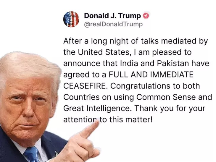 24 News Update नेशनल डेस्क। अमेरिका के राष्ट्रपति डोनाल्ड ट्रम्प ने एक ऐतिहासिक बयान में कहा कि भारत और पाकिस्तान के बीच युद्धविराम पर सहमति बन गई है। उन्होंने इसे अमेरिकी मध्यस्थता में देर रात चली लंबी बातचीत का परिणाम बताया और दोनों देशों को इस समझौते के लिए बधाई दी। ट्रम्प ने ट्विटर पर लिखा, “भारत और पाकिस्तान अब तुरंत और पूरी तरह युद्धविराम के लिए राजी हो गए हैं। मैं दोनों देशों को समझदारी से भरा फैसला लेने के लिए बधाई देता हूं।“