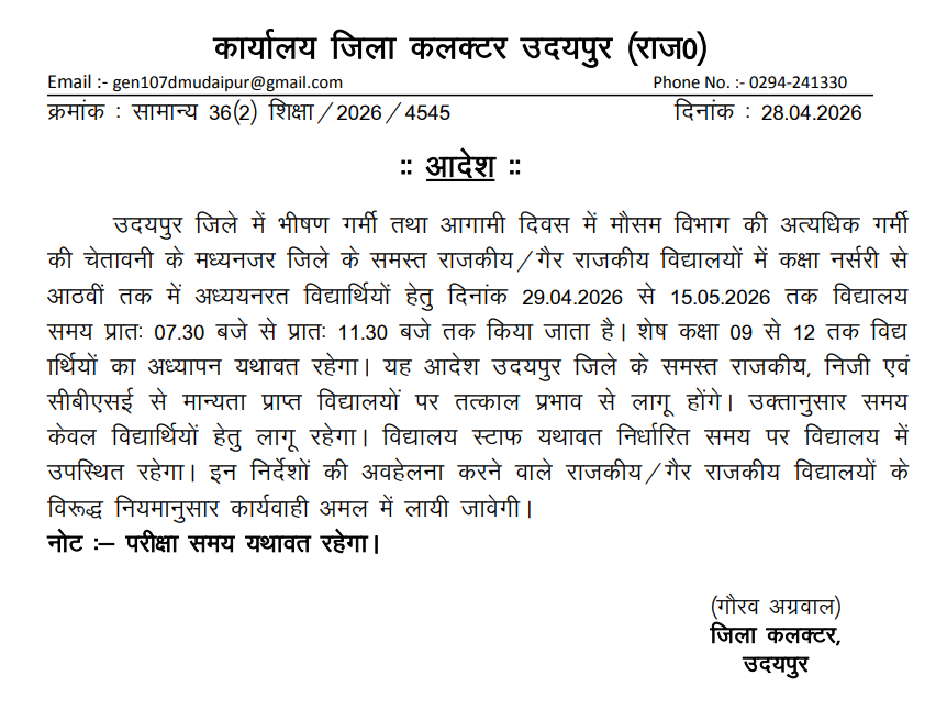 उदयपुर, 28 अप्रैल।भीषण गर्मी और मौसम विभाग की चेतावनी के बीच उदयपुर जिला प्रशासन ने विद्यार्थियों के स्वास्थ्य को ध्यान में रखते हुए बड़ा निर्णय लिया है। जिला कलक्टर गौरव अग्रवाल ने आदेश जारी कर नर्सरी से कक्षा 8वीं तक के सभी स्कूलों का समय बदल दिया है। आदेश के अनुसार 29 अप्रैल से 15 मई 2026 तक जिले के समस्त राजकीय, गैर-राजकीय एवं सीबीएसई से संबद्ध विद्यालयों में कक्षाएं सुबह 7:30 बजे से 11:30 बजे तक संचालित होंगी। ⏰ 9वीं से 12वीं तक समय यथावत प्रशासन ने स्पष्ट किया है कि कक्षा 9वीं से 12वीं तक के विद्यार्थियों के लिए स्कूल समय में कोई बदलाव नहीं किया गया है। उनका संचालन पूर्व निर्धारित समयानुसार ही होगा। 👨🏫 स्टाफ रहेगा सामान्य समय पर उपस्थित यह आदेश केवल विद्यार्थियों के लिए लागू होगा। विद्यालयों का स्टाफ पूर्व निर्धारित समय पर ही उपस्थित रहेगा। साथ ही परीक्षा समय में भी किसी प्रकार का परिवर्तन नहीं किया गया है। ⚠️ आदेश की अवहेलना पर होगी कार्रवाई जिला प्रशासन ने निर्देश दिए हैं कि सभी सरकारी व निजी स्कूल इस आदेश की सख्ती से पालना सुनिश्चित करें। किसी भी प्रकार की लापरवाही पर संबंधित संस्था के खिलाफ नियमानुसार कार्रवाई की जाएगी। 👉 गौरतलब है कि इन दिनों उदयपुर सहित पूरे राजस्थान में तापमान 40 डिग्री के पार पहुंच रहा है। ऐसे में छोटे बच्चों को लू और हीटवेव से बचाने के लिए प्रशासन ने यह कदम उठाया है। Share this: Share on X (Opens in new window) X Share on Facebook (Opens in new window) Facebook More Email a link to a friend (Opens in new window) Email Share on WhatsApp (Opens in new window) WhatsApp Like this:Like Loading... Related Discover more from 24 News Update Subscribe to get the latest posts sent to your email. Type your email… Subscribe Post navigation सोशल मीडिया पर तलवार लहराने वाला युवक गिरफ्तार, पुलिस की सख्त कार्रवाई उदयपुर में गिलहरी का आतंक: 18 लोगों को काटा, डॉक्टर भी हैरान