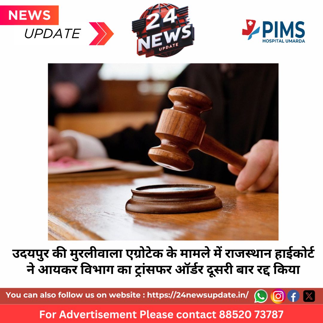 24 News Update उदयपुर/जयपुर। राजस्थान हाईकोर्ट ने उदयपुर स्थित मुरलीवाला एग्रोटेक प्राइवेट लिमिटेड के मामले में आयकर विभाग द्वारा जारी ट्रांसफर ऑर्डर को दूसरी बार अवैध करार देते हुए रद्द कर दिया है। चीफ जस्टिस के.आर. श्रीराम और जस्टिस रवि चिरानिया की खंडपीठ ने आयकर विभाग की कार्रवाई को ‘अड़ियल और मनमाना’ बताते हुए कहा कि करदाता को सुनवाई का पूरा अवसर देना अनिवार्य है।