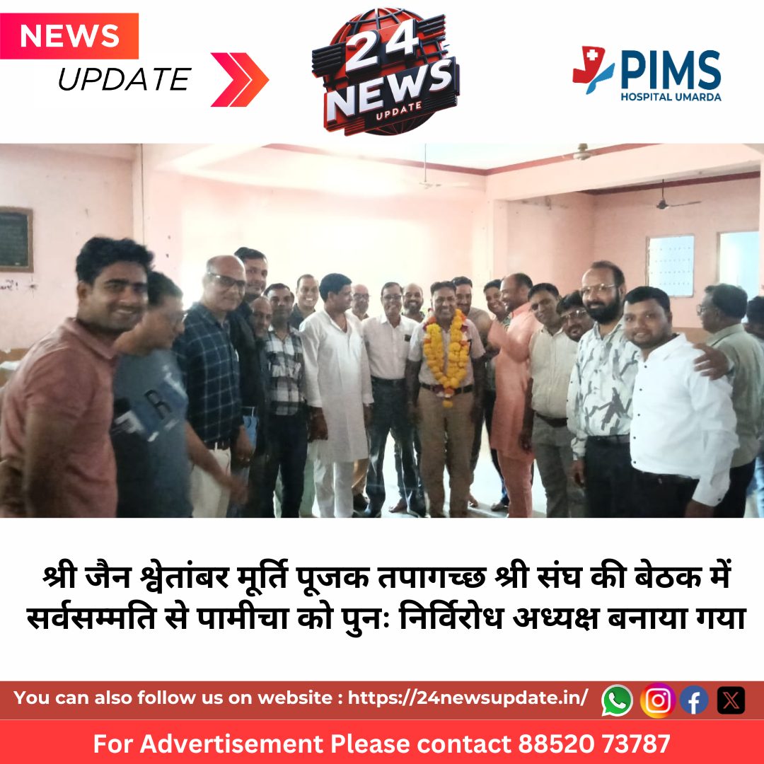 24 news Update निम्बाहेडा कविता पारख। प्रयुषण पर्व की समाप्ति पर दिनांक 30 अगस्त 2025 को महावीर भवन में श्री जैन श्वेतांबर मूर्ति पूजक तपागच्छ श्री संघ की सामूहिक गोठ का आयोजन किया गया। संघ के प्रवक्ता मनोहर लाल जैन (बोहरा) ने बताया कि श्री संघ कि साधारण सभा की बैठक भी रखी गई जिसमें आगामी दो वर्षों के लिए सर्वसम्मति से दिलीप पामेचा को को पुनः निर्विरोध अध्यक्ष बनाया गया. पामेचा ने श्री संघ के सभी सदस्यों का आभार जताया एवं विगत कार्यकाल में दिए गए सहयोग के लिए संघ के सभी सदस्यों का आभार प्रकट किया. श्री संघ के सभी सदस्यों ने फूलमाला पहना कर पामेचा का हार्दिक स्वागत और अभिनंदन किया एवं बधाइयां दी. इस अवसर पर युवा संघ के अध्यक्ष नितिन नागोरी महासचिव रत्नेश छाजेड अशोक कुमार बोहरा ,तख्तमल सिंघवी भी मुकेश नागोरी ,राजीव लसोड़, दिलीप नागोरी परिवार सहित उपस्थित थे।