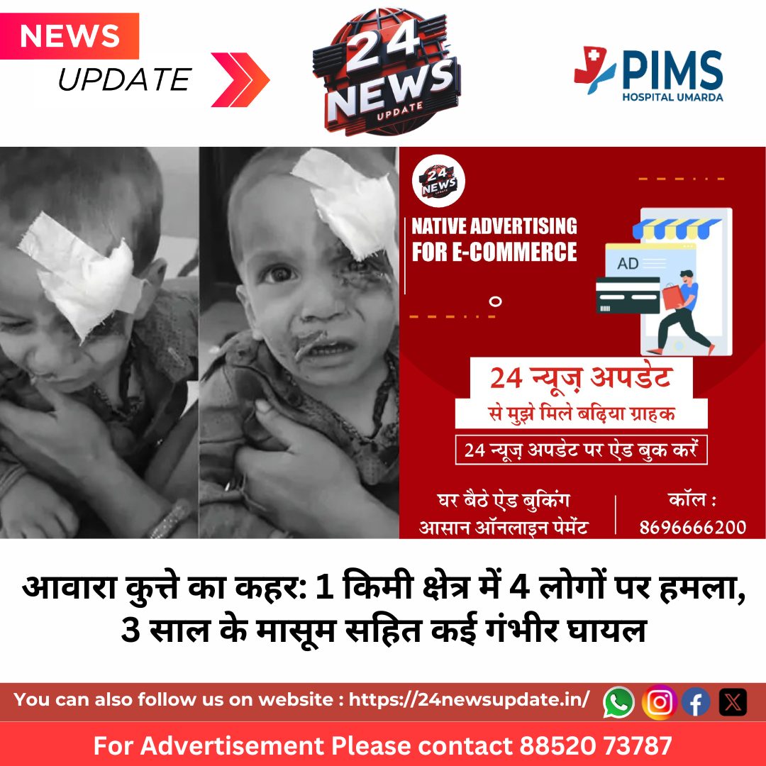 24 News Update उदयपुर। जिले के नयागांव उपखंड क्षेत्र में एक आवारा कुत्ते ने पिछले 24 घंटे में लगभग एक किलोमीटर के दायरे में चार लोगों पर हमला कर उन्हें गंभीर रूप से घायल कर दिया। हमले में शामिल एक 3 साल का बच्चा भी है, जिसके होंठ को कुत्ते ने बुरी तरह नोच डाला है, जिससे उसकी स्थिति गंभीर बनी हुई है। इस घटना ने इलाके में दहशत फैला दी है।