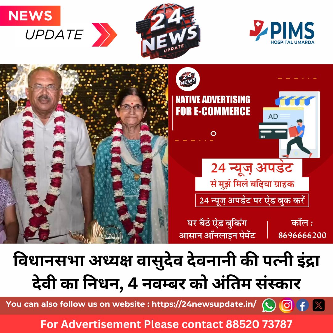 24 News Update जयपुर। राजस्थान विधानसभा अध्यक्ष वासुदेव देवनानी की पत्नी इंद्रा देवी का आज देर शाम एसएमएस हॉस्पिटल में उपचार के दौरान निधन हो गया। वे पिछले कई दिनों से गंभीर रूप से बीमार थीं और वेंटिलेटर सपोर्ट पर थीं।