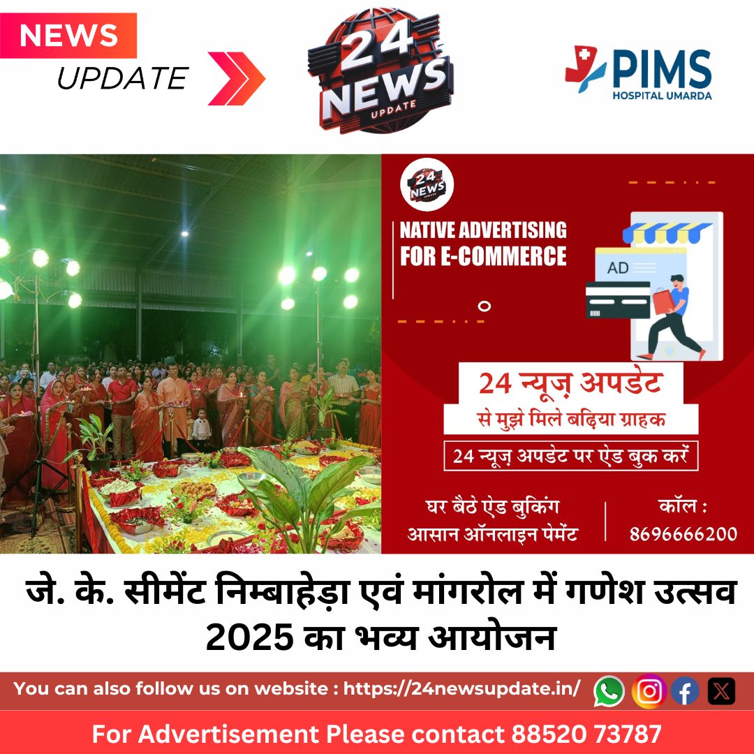 24 News Update निम्बाहेड़ा कविता पारख — जे. के. सीमेंट ऑफिसर्स क्लब, नीमबाहेड़ा व मांगरोल दिनांक 27 अगस्त से 6 सितंबर, 2025 तक गणेश उत्सव 2025 का भव्य आयोजन कर रहा है। इस 11 दिवसीय उत्सव में प्रतिदिन आरती, विभिन्न कार्यक्रमों और सामुदायिक भोजन का आयोजन किया जा रहा है। यह उत्सव एकता, भक्ति और सांस्कृतिक उत्साह का प्रतीक है, जो कर्मचारियों और उनके परिवारों को एक साथ लाने के लिए विभिन्न प्रकार के भक्तिमय और मनोरंजक कार्यक्रमों का आयोजन कर रहा है निम्बाहेड़ा की कैलाश नगर कॉलोनी में यूनिट हेड श्री मनीष तोषनीवाल और एच.आर. हेड श्री प्रभाकर मिश्रा ने मुख्य अतिथि के रूप में 27 अगस्त, 2025 को भगवान गणेश की विधिवत पूजा-अर्चना कर मूर्ति स्थापित की और उत्सव