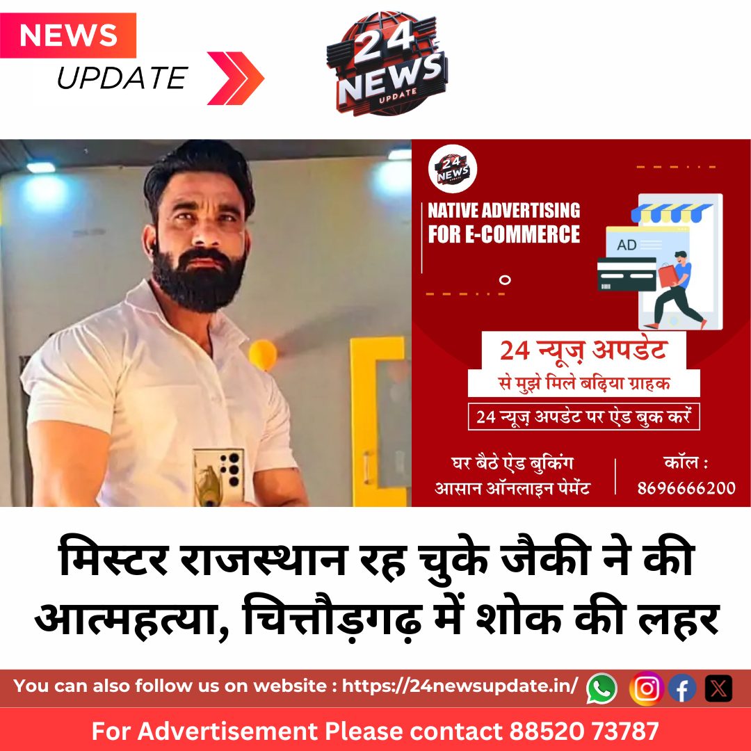 24 News Update चित्तौड़गढ़। शहर के प्रतिष्ठित बॉडीबिल्डर और “वॉरियर फिटनेस जिम” के संचालक जय किशन लोठ उर्फ जैकी (42) ने गुरुवार सुबह आत्महत्या कर ली। यह हृदयविदारक घटना कोतवाली थाना क्षेत्र के महाराणा प्रताप सेतु मार्ग स्थित जिम परिसर में सामने आई, जहां जैकी का शव फंदे से लटका हुआ मिला।