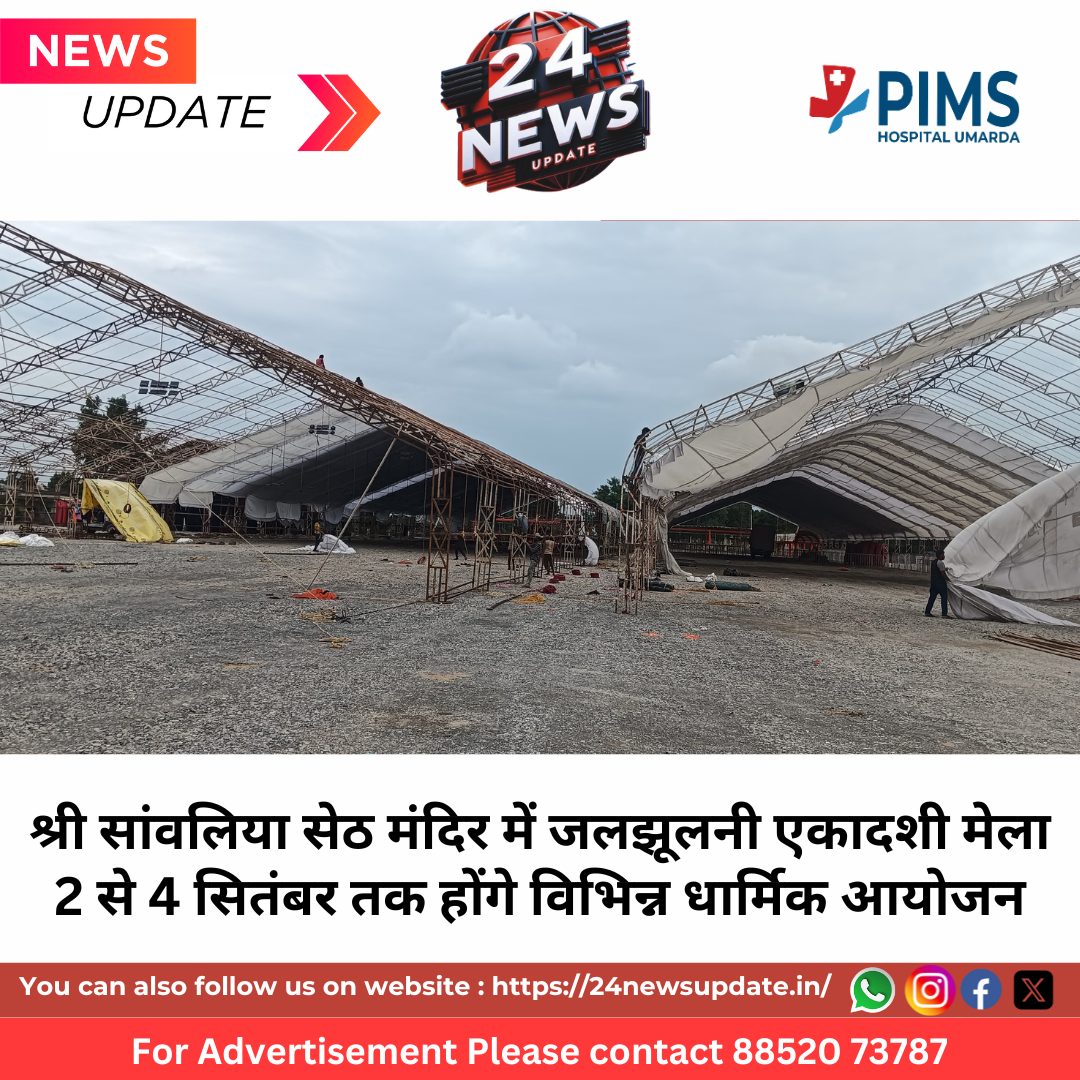 24 News Update चित्तौड़गढ़। मेवाड़ के सुप्रसिद्ध कृष्णधाम श्री सांवलियाजी, मण्डफिया मंदिर में हर वर्ष की भांति इस वर्ष भी जलझूलनी एकादशी मेला 02 से 04 सितम्बर तक बड़े उत्साह और श्रद्धा के आयोजित किया जाएगा। इस अवसर पर विशाल मेले में भव्य रथ यात्राएं, भजन संध्याएं, कवि सम्मेलन, सांस्कृतिक कार्यक्रम एवं आतिशबाजी श्रद्धालुओं के लिए आकर्षण का केंद्र रहेंगी।