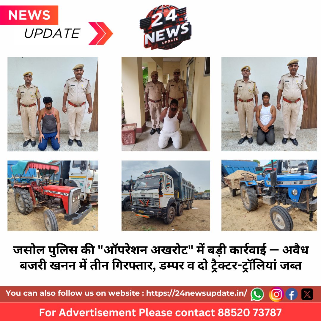 24 News Update बालोतरा। अवैध बजरी खनन के विरुद्ध चलाए जा रहे “ऑपरेशन अखरोट” के तहत थाना जसोल पुलिस ने सरहद पुराना बोरावास और सरहद कनाना क्षेत्र में लूणी नदी के बहाव क्षेत्र में अवैध बजरी खनन व परिवहन करते हुए तीन आरोपियों को गिरफ्तार किया है। पुलिस ने मौके से एक डम्पर और दो ट्रैक्टर-ट्रॉलियां भी जब्त की हैं। यह कार्रवाई महानिरीक्षक पुलिस, जोधपुर रेंज श्री विकास कुमार आईपीएस के निर्देशन में पुलिस अधीक्षक बालोतरा श्री अमित जैन आईपीएस के नेतृत्व में की गई।