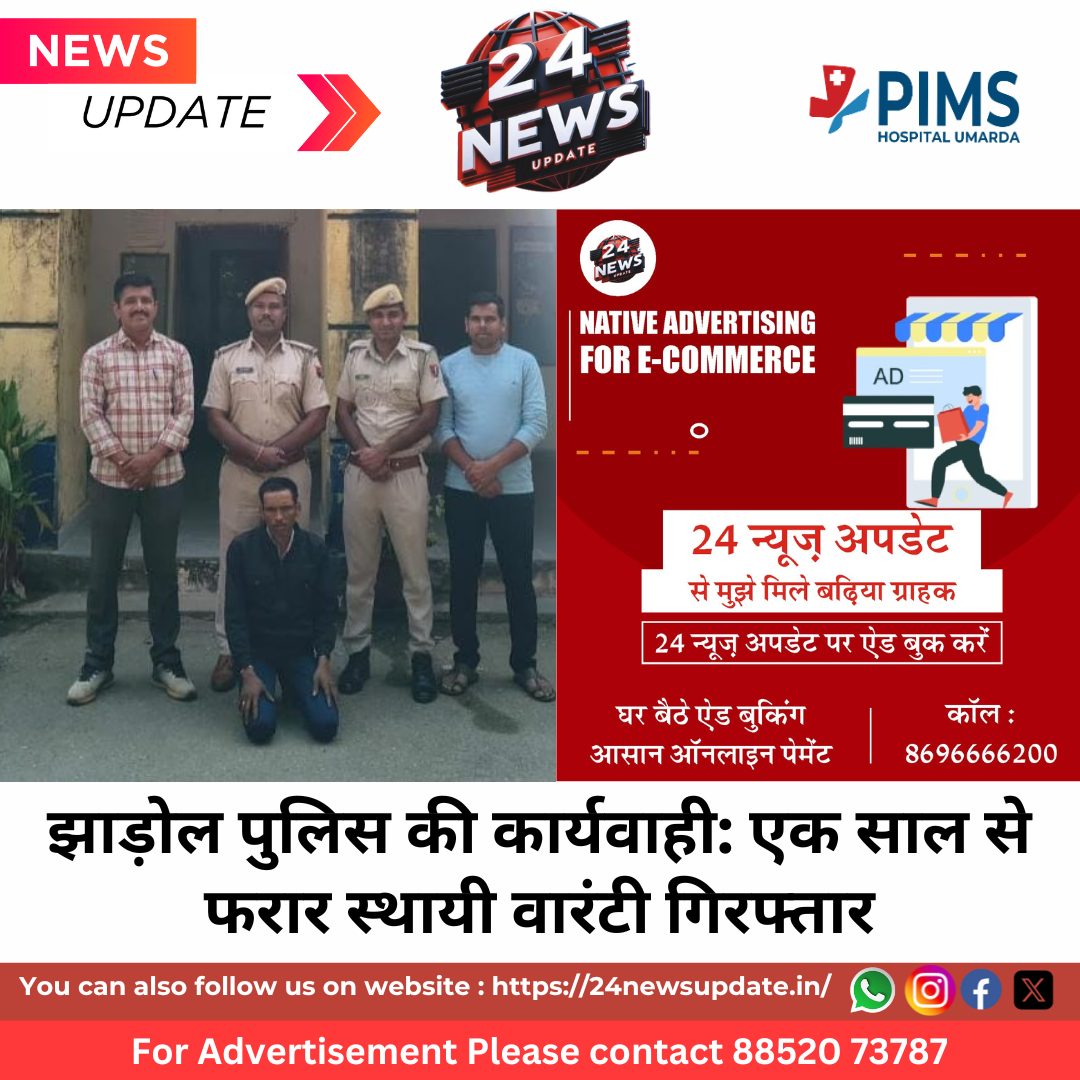 24 News Update उदयपुर | थाना झाड़ोल: पुलिस महानिरीक्षक, उदयपुर रेंज गौरव श्रीवास्तव द्वारा वांछित अपराधियों एवं स्थायी वारंटियों की धरपकड़ हेतु चलाए जा रहे विशेष अभियान “ऑपरेशन सुदर्शन चक्र” के तहत झाड़ोल पुलिस ने एक बड़ी सफलता हासिल की है। जिला पुलिस अधीक्षक योगेश गोयल के निर्देशानुसार, अतिरिक्त पुलिस अधीक्षक अंजना सुखवाल (खेरवाड़ा) एवं वृताधिकारी झाड़ोल नेत्रपाल सिंह के सुपरविजन में थानाधिकारी फेलीराम मीणा के नेतृत्व में गठित टीम ने एक वर्ष से फरार स्थायी वारंटी को गिरफ्तार किया है।