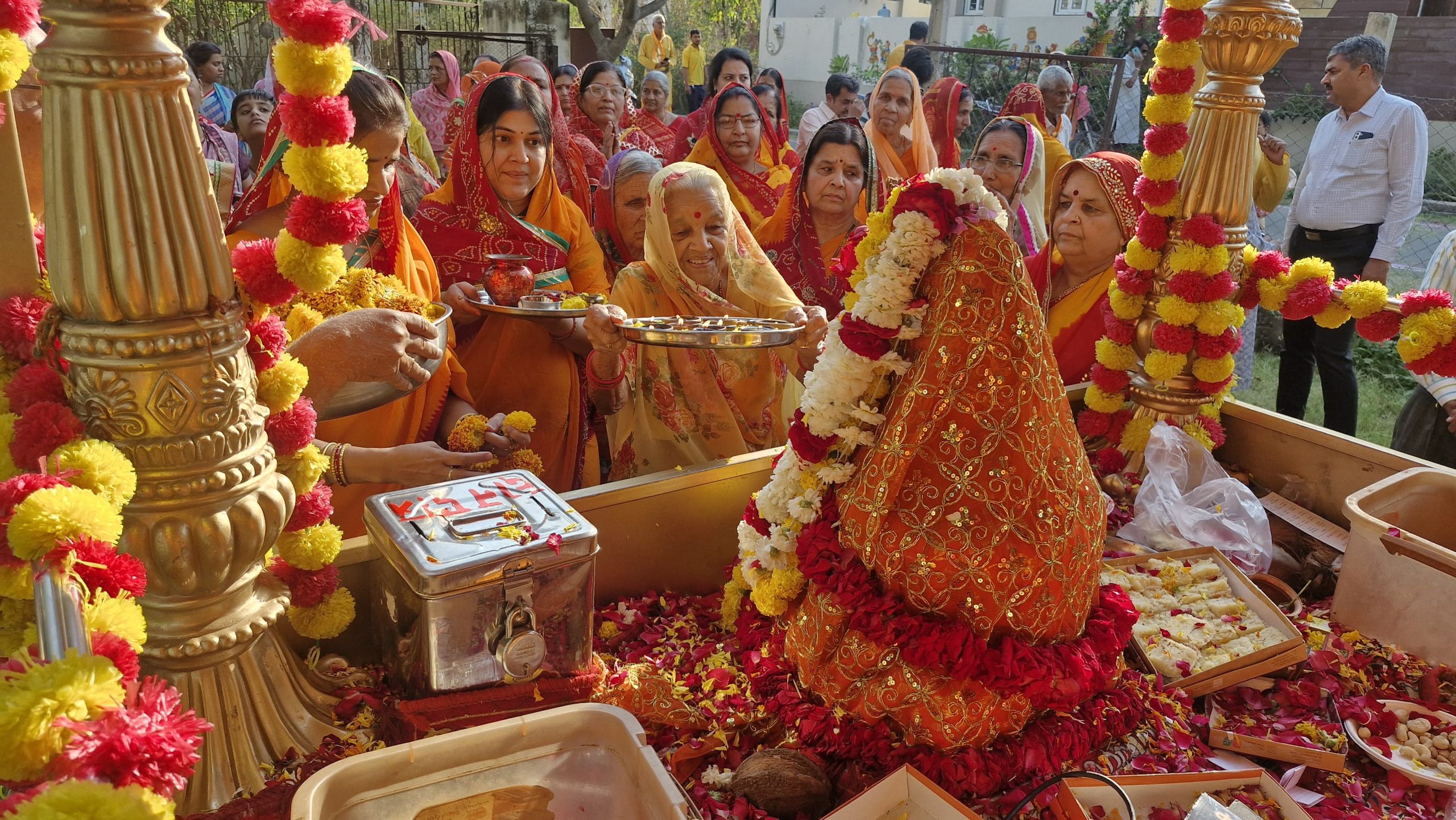24newsupdate उदयपुर। अखिल विश्व गायत्री परिवार द्वारा निकाली जा रही ज्योति कलश रथयात्रा के दर्शन के लिए आज उदयपुर में भक्त उमड़ पड़े। भुवाणा सर्किल से सुबह शुरू हुई यात्रा शाम होते-होते मंगल श्री गार्डन पहुंची जहां बड़ी तादाद में महिलाएं मौजूद रही। मंगल श्री गार्डन पहुंची ज्योति कलश रथ यात्रा का भक्ति भाव के साथ स्वागत किया गया तो वहीं दर्शन के लिए पहुंचे भक्तों ने विधि विधान से पूजा अर्चना करते हुए आरती की। मंगल श्री गार्डन में कमला श्रीमाली द्वारा यात्रा का स्वागत किया गया। इस दौरान मंगल श्री गार्डन के समीप रहने वाले कई परिवार भी दर्शन के लिए पहुंचे। ज्योति कलश रथ यात्रा में स्थापित अखंड ज्योति की आरती कमला श्रीमाली और उनके पुत्र जयंत श्रीमाली सहित परिवार और दर्शन करने आए श्रद्धालुओं द्वारा भक्ति भाव के साथ की गई।