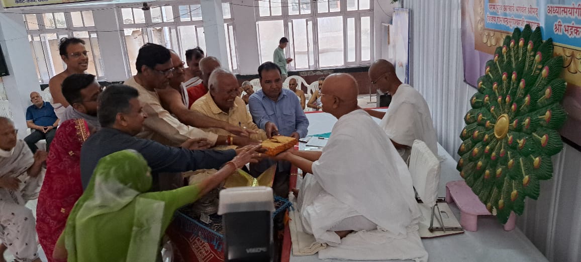24 News Update उदयपुर। मालदास स्ट्रीट स्थित आराधना भवन में जैनाचार्य श्रीमद् विजय रत्नसेन सूरीश्वर महाराज की निश्रा में बडे हर्षोल्लास के साथ चातुर्मासिक आराधना चल रही है। श्रीसंघ के कोषाध्यक्ष राजेश जावरिया ने बताया कि आराधना भवन में पर्युषण महापर्व के तहत आचार्य संघ के सानिध्य में सैकड़ों श्रावक-श्राविकाएं प्रतिदिन सुबह व्याख्यान, सामूहिक ऐकासना व शाम को प्रतिक्रमण आदि की तप आराधना कर रहे है। जावरिया ने बताया कि धर्मसभा में प्रकाशबेन-रणजीतभाई मेहता परिवार की ओर से जैनाचार्यश्री को कल्पसूत्र ग्रंथ अर्पण किया गया। अन्य लाभार्थी द्वारा पांच ज्ञान पूजा एवं अष्टप्रकारी पूजा की गई।