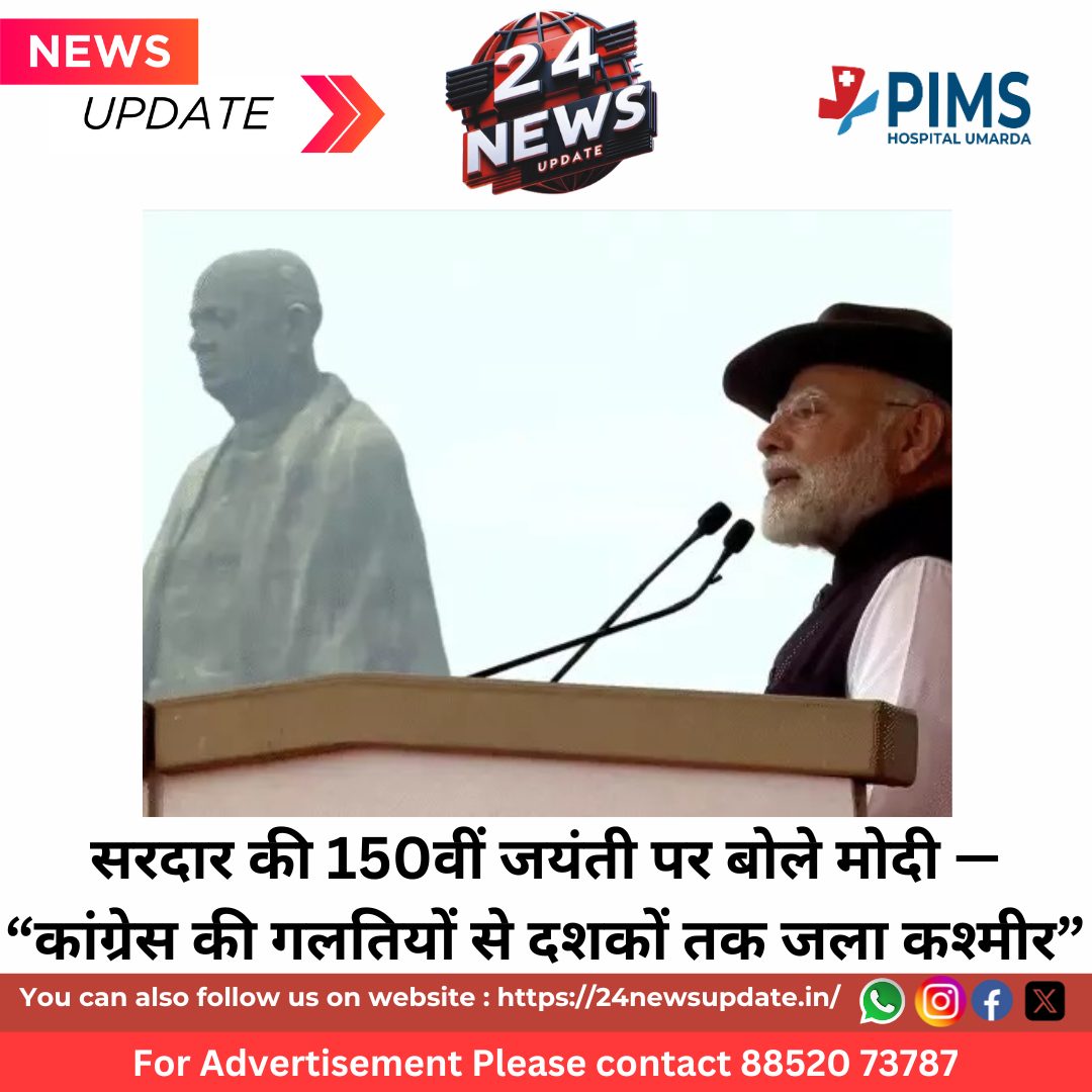 24 News Update गुजरात। प्रधानमंत्री नरेंद्र मोदी शुक्रवार को सरदार वल्लभभाई पटेल की 150वीं जयंती पर गुजरात के एकता नगर पहुंचे। उन्होंने 182 मीटर ऊंची ‘स्टैच्यू ऑफ यूनिटी’ पर पुष्पांजलि अर्पित की और राष्ट्रीय एकता दिवस परेड की सलामी ली।मोदी ने कहा कि सरदार पटेल इतिहास रचने वाले थे, उन्होंने आजादी के बाद 550 रियासतों को भारत में मिलाने का असंभव काम संभव किया। उन्होंने कहा, “सरदार पटेल चाहते थे कि पूरा कश्मीर भारत में शामिल हो, लेकिन तत्कालीन प्रधानमंत्री नेहरू ने ऐसा नहीं होने दिया। कांग्रेस की गलती की आग में कश्मीर दशकों तक जलता रहा।”“कांग्रेस ने वंदे मातरम् को भी बांटा”प्रधानमंत्री ने कहा कि कांग्रेस को अंग्रेजों से गुलाम मानसिकता की विरासत मिली। “अंग्रेजों ने वंदे मातरम् पर रोक लगाने की कोशिश की, पर नाकाम रहे। लेकिन जो काम अंग्रेज नहीं कर पाए, कांग्रेस ने कर दिया — वंदे मातरम् के हिस्से को धार्मिक आधार पर हटा दिया।” मोदी ने कहा, “कांग्रेस ने समाज को बांटा, ब्रिटिश एजेंडा आगे बढ़ाया। सरदार ने एकता की बात की, कांग्रेस ने विभाजन की।”“नक्सलवाद-माओवाद खत्म कर रहेगा भारत”मोदी ने कहा कि देश अब उस दिशा में बढ़ रहा है, जिसका सपना सरदार पटेल ने देखा था।“2014 से पहले 125 जिले माओवादी हिंसा से प्रभावित थे, अब केवल 11 बचे हैं। जब तक देश नक्सलवाद, माओवाद और आतंकवाद से मुक्त नहीं होगा, हम चैन से नहीं बैठेंगे।” परेड में झलकी ‘एक भारत, श्रेष्ठ भारत’ की भावनाराष्ट्रीय एकता दिवस परेड का नेतृत्व महिला अफसरों ने किया। BSF, CRPF, CISF, ITBP समेत 16 टुकड़ियों ने हिस्सा लिया। वायुसेना की सूर्यकिरण टीम ने फ्लाई पास्ट किया, जबकि असम पुलिस के डेयरडेविल्स ने मोटरसाइकिल स्टंट से रोमांच बढ़ाया।10 राज्यों की झांकियों में जम्मू-कश्मीर, गुजरात, महाराष्ट्र, मणिपुर, छत्तीसगढ़, अंडमान-निकोबार समेत अन्य प्रदेशों की झलक देखने को मिली। 15 दिन चलेगा भारत पर्वएकता नगर में 1 से 15 नवंबर तक ‘भारत पर्व 2025’ का आयोजन होगा। इसमें विभिन्न राज्यों की संस्कृति, लोककला और विविधता में एकता की झलक दिखाई जाएगी। Share this: Share on X (Opens in new window) X Share on Facebook (Opens in new window) Facebook More Email a link to a friend (Opens in new window) Email Share on WhatsApp (Opens in new window) WhatsApp Like this:Like Loading... Related Discover more from 24 News Update Subscribe to get the latest posts sent to your email. Type your email… Subscribe Post navigation सड़क खराब? अब जिम्मेदारी तय — हर राष्ट्रीय राजमार्ग पर लगेंगे QR कोड वाले बोर्ड अहमदाबाद में आचार्य सुनीलसागरजी महाराज के ससंघ सानिध्य में सिद्धचक्र महामंडल विधान में सिद्धों को 128 अर्घ्य समर्पित