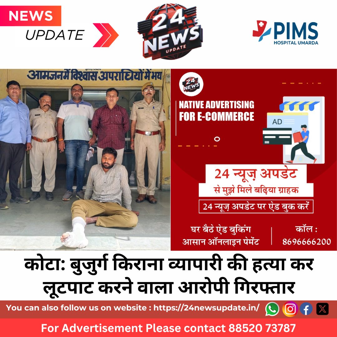 24 News Update जयपुर। कोटा शहर के उद्योग नगर थाना क्षेत्र में एक 70 वर्षीय बुजुर्ग किराना दुकानदार की हत्या कर लूटपाट करने के मामले में पुलिस को बड़ी सफलता मिली है। घटना के 8 दिन बाद पुलिस ने कड़ी मेहनत और तकनीकी सर्विलांस के दम पर मुख्य आरोपी को ढाढ़ देवी नहर के जंगलों से गिरफ्तार कर लिया।