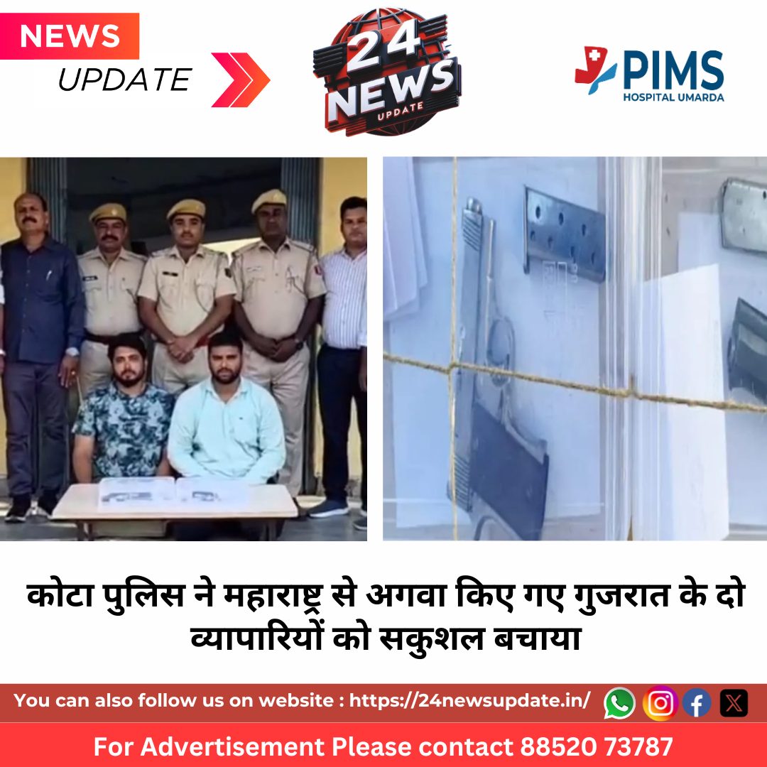 24 News Update जयपुर। कोटा पुलिस ने एक बड़ी कार्रवाई करते हुए महाराष्ट्र से अगवा किए गए गुजरात के दो व्यापारियों को सकुशल मुक्त कराया है। पुलिस ने दो अपहरणकर्ताओं को गिरफ्तार किया और उनके पास से दो पिस्टल तथा एक जिंदा कारतूस बरामद किया। यह गिरोह ब्लैकमेल के लिए गन पॉइंट पर अश्लील वीडियो बनाता था और पहले भी लोगों से लाखों रुपये वसूल चुका है।