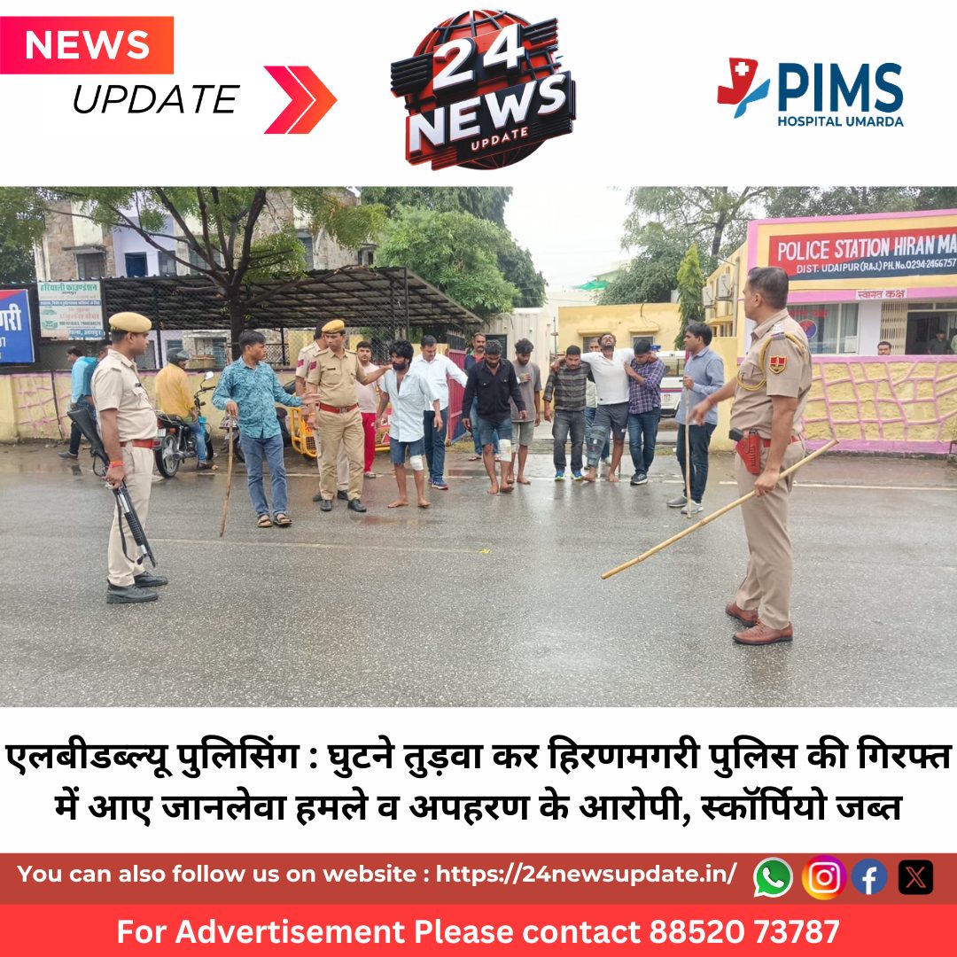 अबकी बार यह हिरणमगरी थाना पुलिस के साथ हुआ है जिसमें सभी आरोपी घुटनों से चोटिल दिखाई दे रहे हैं। संजय बंजारा के अपहरण और जानलेवा हमले के मामले में त्वरित कार्रवाई करते हुए चार अभियुक्तों को गिरफ्तार कर लिया है। घटना में प्रयुक्त ब्लैक रंग की स्कॉर्पियो को भी जब्त किया गया है।