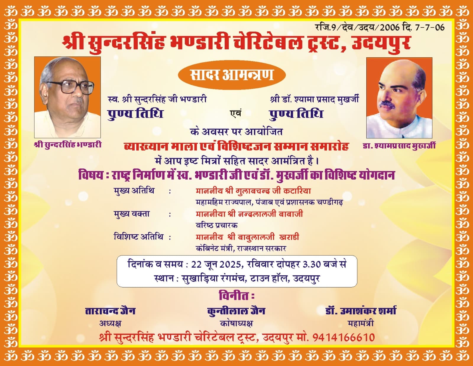 24 न्यूज अपडेट, उदयपुर। सुन्दरसिंह भण्डारी चेरिटेबल ट्रस्ट, उदयपुर के तत्वावधान में स्वर्गीय सुन्दरसिंह भण्डारी एवं डॉ. श्यामा प्रसाद मुखर्जी की पुण्यतिथि के अवसर पर एक भव्य व्याख्यान माला एवं विशिष्टजन सम्मान समारोह का आयोजन 22 जून को सुखाड़िया रंगमंच, टाउन हॉल, उदयपुर में किया जाएगा। यह कार्यक्रम रविवार दोपहर 3.30 बजे से प्रारंभ होगा।