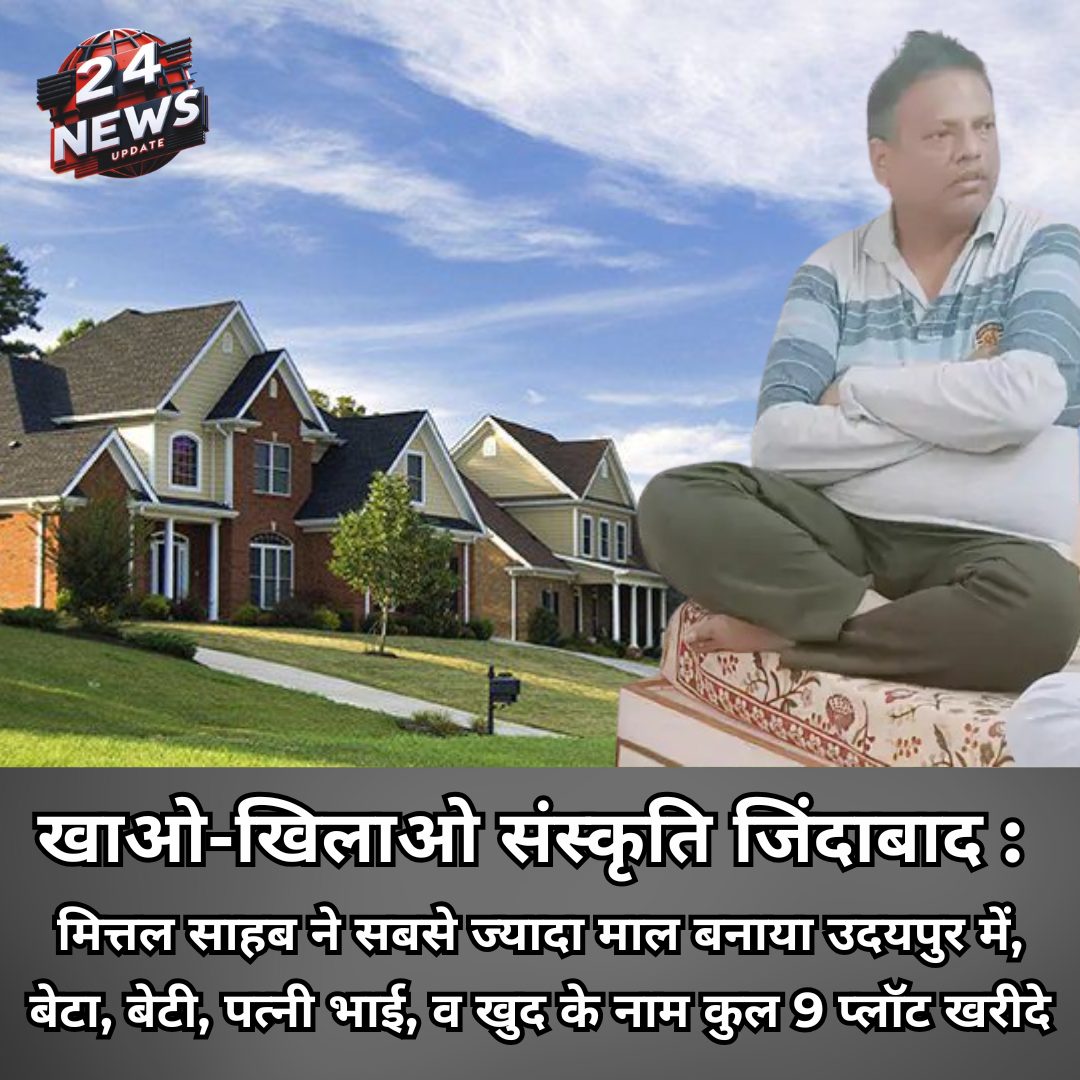 लेकसिटी उदयपुर घूसखोरों का गढ़ बनता जा रहा है। यहां पर आम चर्चा है कि जो भी आता है उपर की पोस्ट पर बैठ कर माल बनाता है और या तो रिसोर्ट या फिर होटल और अगर उसमें इटरेस्ट कम है तो रिश्वत के पैसे से प्लॉट या जमीन जरूर खरीदता है। मित्तल साहब ने भी उदयपुर में कोई कसर नहीं छोड़ी यहां पर दिल खोलकर जमीनें खरीदी। रिश्वत की बहती गंगा में हाथ धोने पर उनके हाथ इनते प्लॉट आए तो सोच लीजिए और कितने कितनों के हाथ कितना माल आया होगा???