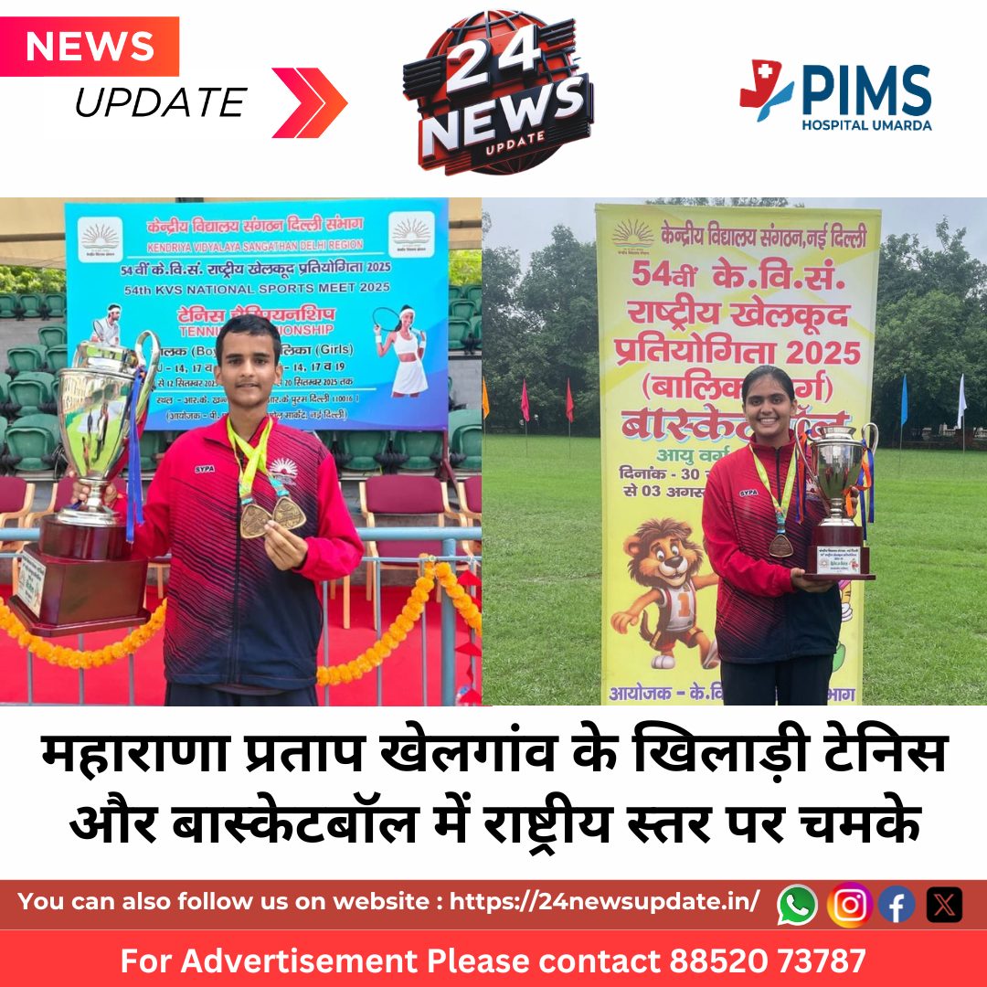 24 News Update उदयपुर। महाराणा प्रताप खेलगांव के टेनिस और बास्केटबॉल खिलाड़ियों ने हाल ही में सम्पन्न केन्द्रीय विद्यालय नेशनल प्रतियोगिता 2025 में शानदार प्रदर्शन कर जिले का नाम रोशन किया।