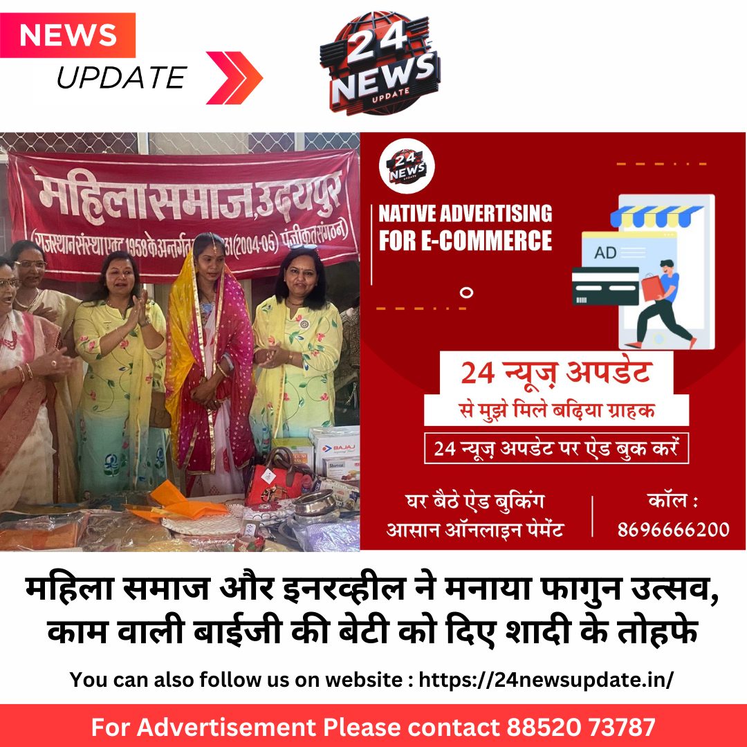24 न्यूज अपडेट. उदयपुर। महिला समाज सोसायटी और इनरव्हील क्लब की ओर से गुरुवार को फागुन उत्सव मनाया गया। महाकाल मंदिर के रुद्राक्ष भवन में आयोजित कार्यक्रम में काम वाली बाईजी की बेटी को “शादी का जोड़ा“ सहित विभिन्न उपहार प्रदान किये गए। महिला समाज सोसायटी की ओर से हर साल इस तरह से किसी न किसी काम वाली बाईजी की बेटी के विवाह पर विभिन्न उपहार प्रदान किए जाते हैं। सोसायटी की अध्यक्ष माया कुम्भट ने बताया कि उपहारों में 10 साड़ी, चादर, 3 मिक्सी, वाटर कैन, आभूषण, बर्तन आदि शामिल थे। 5 हजार का चेक भी दिया गया। दुल्हन को तिलक लगा ज्वेलरी, कंगन पहना चुनरी ओढ़ाकर विदा किया।