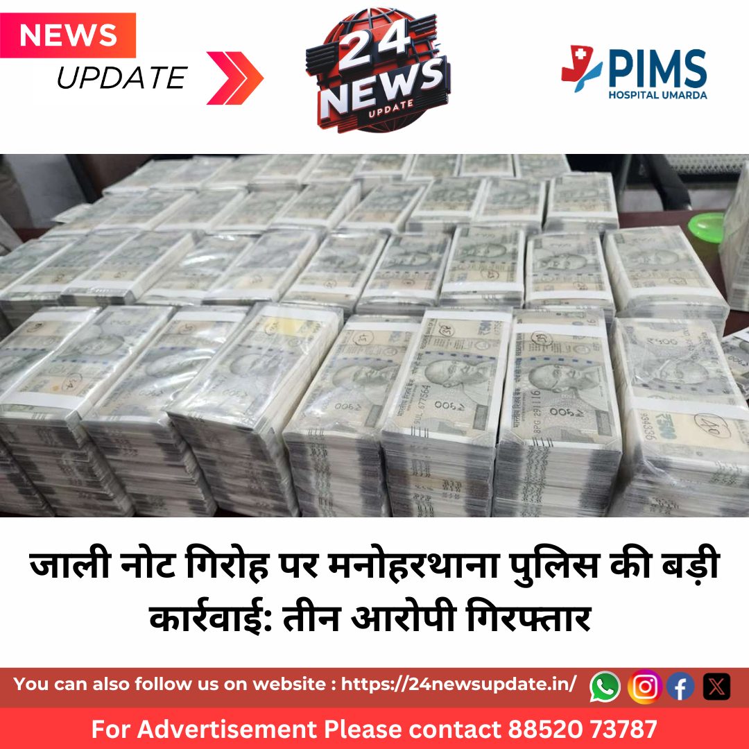 500-500 रुपये के 103 जाली नोट बरामद, परिवहन में प्रयुक्त मोटरसाइकिल जब्त 24 News Update जयपुर 20 फरवरी। राजस्थान में जाली मुद्रा के अवैध कारोबार पर लगाम लगाने के लिए पुलिस मुख्यालय के निर्देश पर चलाए जा रहे विशेष अभियान को झालावाड़ पुलिस ने एक बड़ी कामयाबी में बदल दिया है। जिला पुलिस अधीक्षक अमित कुमार के नेतृत्व में मनोहरथाना पुलिस टीम ने गश्त और नाकाबंदी के दौरान जाली नोटों का चलन करने वाले एक गिरोह का भंडाफोड़ किया है। पुलिस ने आरोपियों के कब्जे से ₹500-500 के कुल 103 जाली नोट बरामद किए हैं। एसपी कुमार ने बताया कि सफलता यह कार्रवाई उस समय हुई जब मनोहरथाना थानाधिकारी महेंद्र कुमार यादव के नेतृत्व में पुलिस टीम दांगीपुरा जोड़ पर मुस्तैदी से नाकाबंदी कर रही थी। इसी दौरान अकलेरा रोड की तरफ से एक मोटरसाइकिल पर सवार तीन संदिग्ध युवक आते दिखाई दिए। पुलिस की मौजूदगी देख आरोपियों ने भागने की कोशिश की और मोटरसाइकिल घुमाने लगे, लेकिन सतर्क पुलिस जाब्ते ने घेराबंदी कर उन्हें मौके पर ही डिटेन कर लिया। संदेह होने पर जब तीनों युवकों की गहनता से तलाशी ली गई, तो उनके पास से भारतीय मुद्रा के ₹500 मूल्य के 103 जाली नोट बरामद हुए। पुलिस ने तुरंत कार्रवाई करते हुए नकली नोटों की खेप और परिवहन में इस्तेमाल की गई मोटरसाइकिल को ज़ब्त कर लिया। पकड़े गए आरोपियों की पहचान कमल सिंह तंवर (30), रामचरण उर्फ कालू तंवर (35) निवासी दांगीपुरा और देवसिंह तंवर (30) निवासी मनोहरथाना के रूप में हुई। इस पूरे मामले में कांस्टेबल तेजाराम की विशेष और सक्रिय भूमिका रही, जिनके इनपुट से इस नेटवर्क को तोड़ना संभव हो सका। फिलहाल थाना झालरापाटन में संबंधित धाराओं के तहत प्रकरण दर्ज कर लिया गया है और पुलिस आरोपियों से पूछताछ कर रही है ताकि यह पता लगाया जा सके कि इन नकली नोटों की छपाई कहाँ हो रही थी और इनके तार और किन-किन गिरोहों से जुड़े हैं। Share this: Share on X (Opens in new window) X Share on Facebook (Opens in new window) Facebook More Email a link to a friend (Opens in new window) Email Share on WhatsApp (Opens in new window) WhatsApp Like this:Like Loading... Related Discover more from 24 News Update Subscribe to get the latest posts sent to your email. Type your email… Subscribe Post navigation राजस्थान पुलिस की बड़ी अपील, अपनों से बिछड़े इन 3 चेहरों को ढूंढने में करें मदद खाटूधाम में आस्था का महासमागम : आठ दिवसीय लक्खी फाल्गुन मेले का शुभारंभ, 27 फरवरी को मुख्य एकादशी मेला