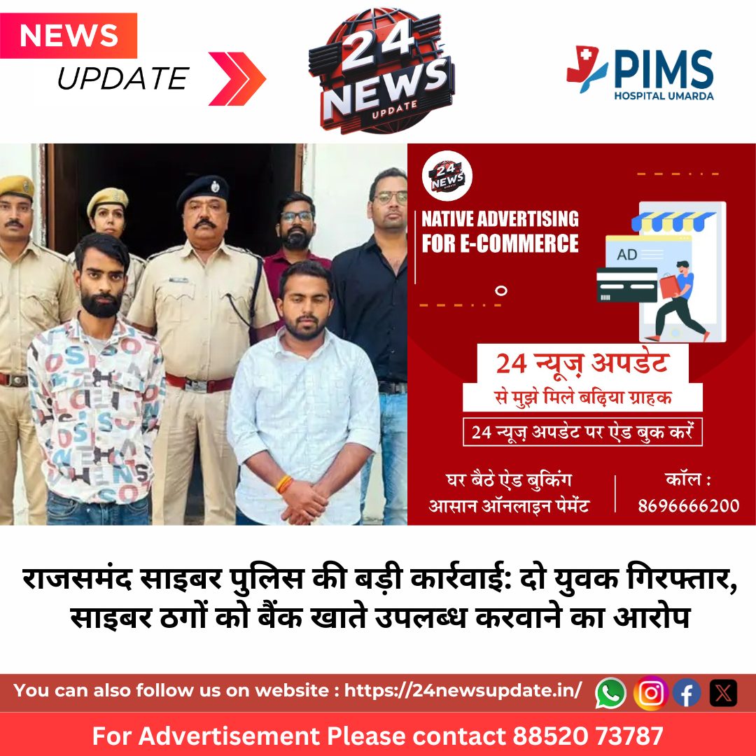 24 News Update राजसमंद। पुलिस मुख्यालय जयपुर और उदयपुर रेंज के निर्देश पर चलाए जा रहे विशेष अभियान के तहत राजसमंद साइबर पुलिस को बड़ी सफलता हाथ लगी है। पुलिस ने साइबर ठगी में मददगार दो म्यूल खाताधारकों को गिरफ्तार किया है। आरोपियों की पहचान अभिषेक आमेटा (28), निवासी हाथीनाडा कांकरोली और लविश परियानी (25), निवासी कांकरोली के रूप में हुई है।