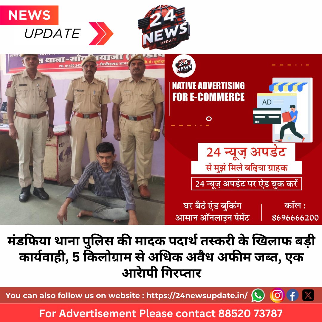 पुलिस अधीक्षक श्री सुधीर जोशी ने बताया कि पुलिस मुख्यालय जयपुर द्वारा अवैध मादक पदार्थों की धरपकड़ हेतु चलाये जा रहे अभियान के तहत दिनांक 17 मार्च 2025 को अतिरिक्त पुलिस अधीक्षक मुख्यालय सरिता सिंह के निर्देशन में एवं वृत्ताधिकारी भदेसर अनिल शर्मा के निकटतम पर्यवेक्षण मे गोकुल लाल डांगी थानाधिकारी थाना मण्डफिया मय जाप्ता एएसआई कालुसिंह, कानि. विजेश , महेन्द्र कुमार ,कालुराम , मनोज कुमार, चालक नारायण लाल द्वारा दौराने नाकाबंदी आरोपी दिनेश पिता पूनमाराम जाति विश्नोई (भादू) उम्र 29 साल निवासी सरनाउ थाना सांचौर जिला जालौर राज. के कब्जे से 05 किलो 147 ग्राम मादक पदार्थ अवैध अफिम को परिवहन करते हुये को गिरफतार कर उक्त मादक पदार्थ अवैध अफिम को जप्त किया गया। मुल्जिम से अवैध अफिम की खरीद फरोख्त के सम्बंध मे अनुसंधान जारी है।