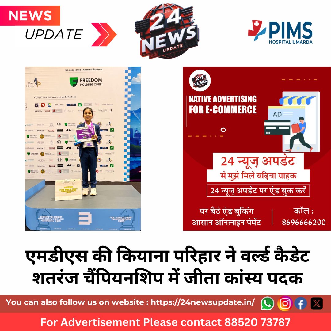 24 न्यूज अपडेट, उदयपुर। भारत की युवा शतरंज प्रतिभा कियाना परिहार ने वर्ल्ड कैडेट शतरंज चैंपियनशिप 2025 में अंडर-10 लड़कियों की श्रेणी में कांस्य पदक जीतकर अंतरराष्ट्रीय मंच पर देश का नाम गौरवान्वित किया। कियाना ने 11 राउंड में 8.5 अंक हासिल किए और उनका प्रदर्शन रेटिंग 1897 रहा, जो उनके प्रारंभिक रेटिंग 1728 से उल्लेखनीय उछाल है। पूरे टूर्नामेंट में कियाना ने लगातार उत्कृष्ट प्रदर्शन किया और क्रोएशिया की जोसिपा गैस्पारैक, कज़ाखस्तान की सद्वोकसोवा सबीना और रौबदार मरियम, फ़िडे के वित्सियुक अलेक्सेंडर, यूएसए की ईमेल्यानोवा और कम ओलिविया को हराकर कांस्य पदक अपने नाम किया। इसके अलावा उन्होंने दो मैच ड्रॉ भी खेले।