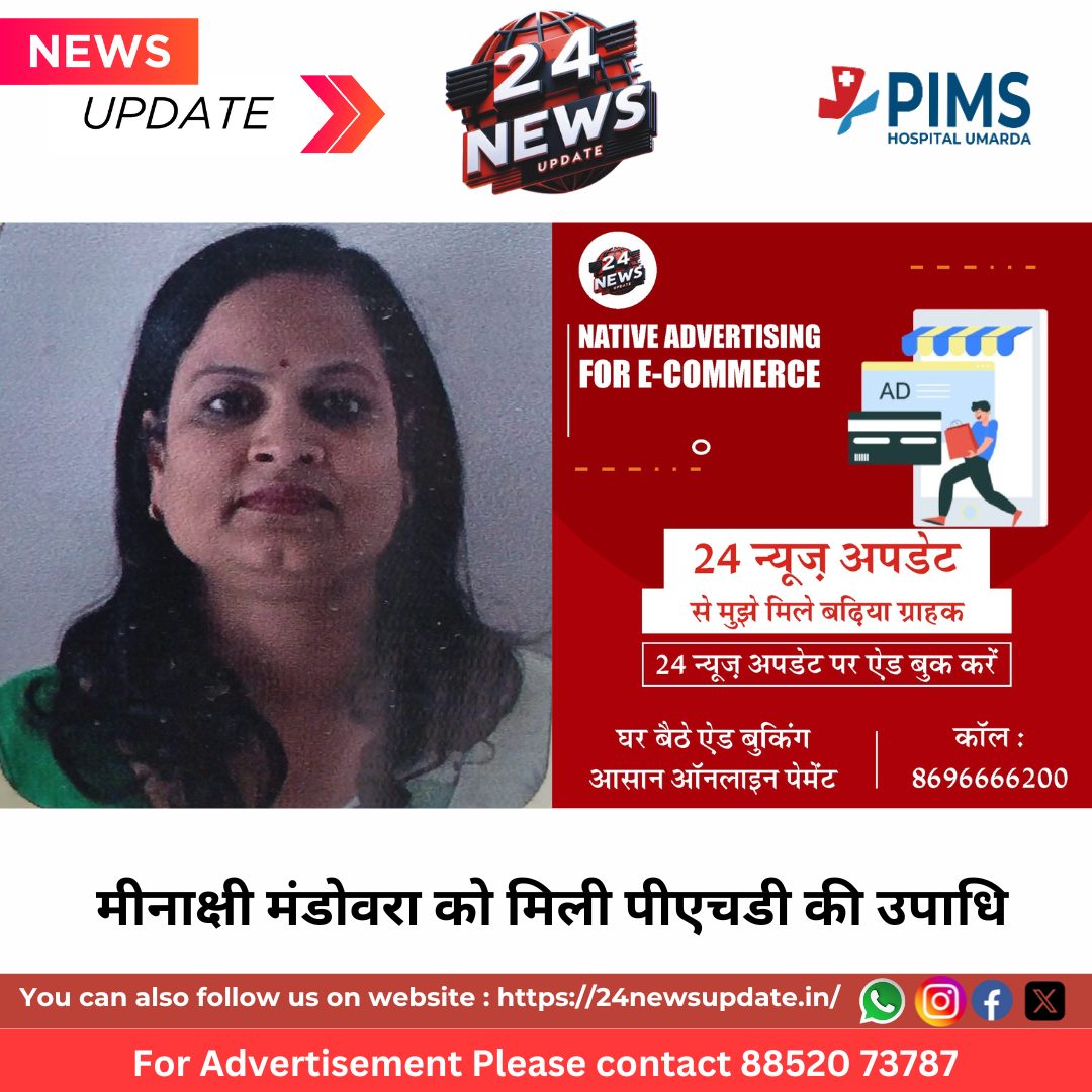 24 News Update उदयपुर। राजस्थान विद्यापीठ डीम्ड-टू-बी विश्वविद्यालय ने सामाजिक विज्ञान संकाय में शोधरत मीनाक्षी मंडोवरा को पीएचडी की उपाधि प्रदान की है। उन्होंने “उदयपुर जिले की ग्रामीण एवं शहरी महिलाओं में राजनीतिक जागरूकता एवं राजनीतिक प्रतिनिधित्व : एक तुलनात्मक अध्ययन” विषय पर अपना शोध कार्य पूरा किया। यह शोध कार्य उन्होंने डॉ. अपर्णा श्रीवास्तव के निर्देशन में संपन्न किया।