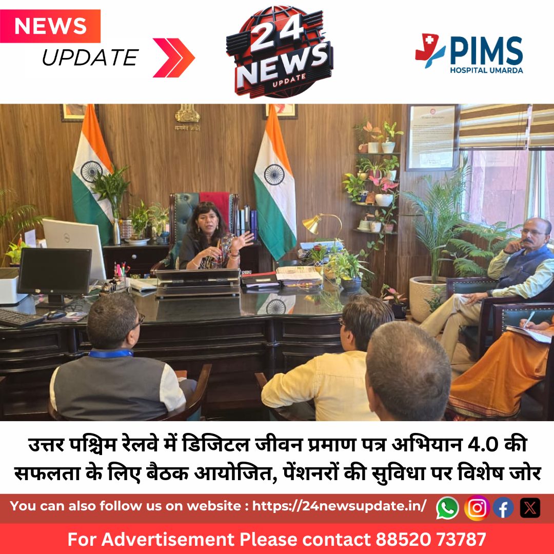 24 News Update जयपुर। उत्तर पश्चिम रेलवे मुख्यालय, जयपुर में गुरुवार, 13 नवम्बर 2025 को प्रधान वित्त सलाहकार सुश्री गीतिका पाण्डेय की अध्यक्षता में एक महत्वपूर्ण बैठक आयोजित की गई। बैठक का उद्देश्य उत्तर पश्चिम रेलवे पर चल रहे डिजिटल जीवन प्रमाण पत्र अभियान 4.0 के सफल आयोजन के लिए रणनीति तय करना था।