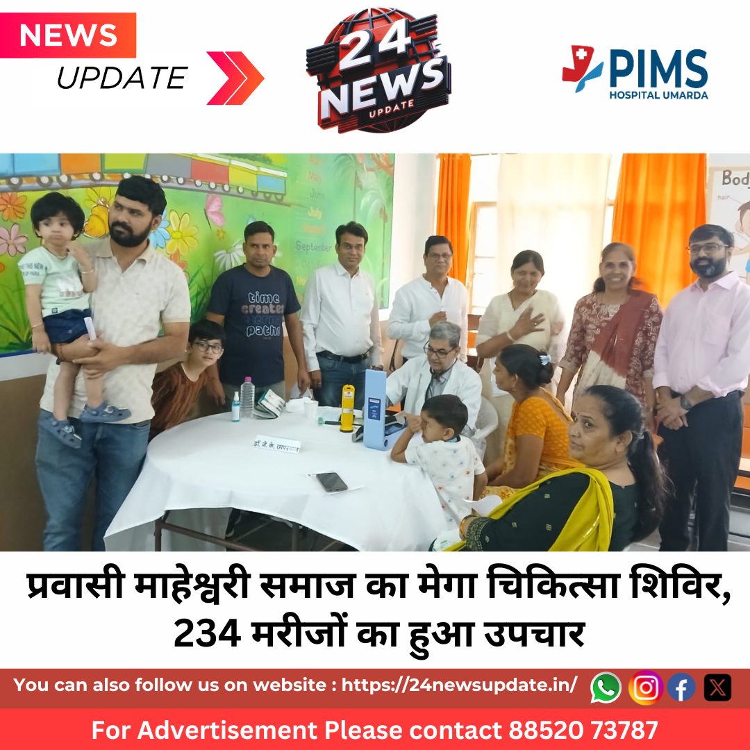 24 News Update उदयपुर। प्रवासी माहेश्वरी समाज की ओर से रविवार को महेश सेवा संस्थान, चित्रकूट नगर में विशाल चिकित्सा शिविर का आयोजन किया गया। शिविर में विभिन्न चिकित्सा विशेषज्ञों ने मरीजों का परामर्श देकर उनका उपचार किया।