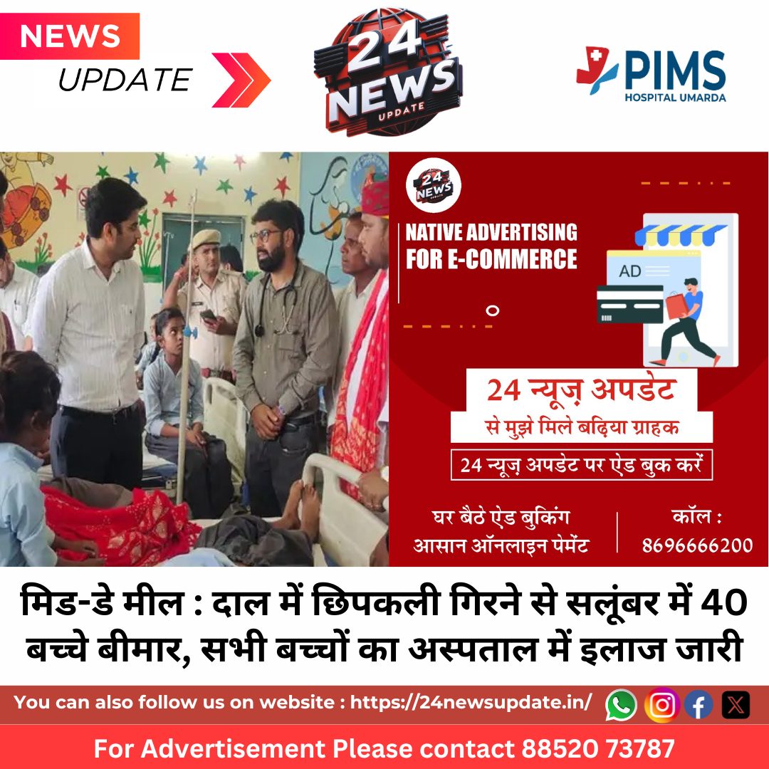 24 News Update उदयपुर/सलूंबर । सलूंबर के लसाड़िया क्षेत्र में मंगलवार को मिड-डे मील बच्चों के लिए आफत बन गया। डाईखेड़ा स्थित राजकीय उच्च प्राथमिक विद्यालय में भोजन करते ही करीब 40 बच्चों की तबीयत अचानक बिगड़ गई। वजह बनी बच्चों को परोसी गई दाल, जिसमें छिपकली गिर जाने की बात सामने आई है।