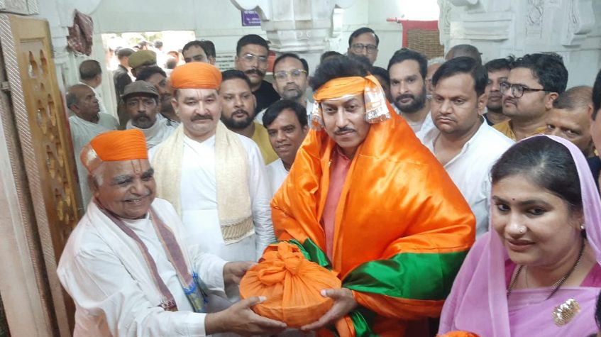 24 News update udaipur उद्योग एवं वाणिज्य, सूचना प्रौद्योगिकी एवं संचार, युवा मामले एवं खेल मंत्री कर्नल राज्यवर्धन सिंह राठौड़ ने शनिवार को नाथद्वारा स्थित श्रीनाथजी मंदिर में राजभोग झांकी के दर्शन कर प्रदेशवासियों की खुशहाली की कामना की। इस अवसर पर राजसमंद विधायक दीप्ति माहेश्वरी सहित अन्य जनप्रतिनिधि और भाजपा पदाधिकारी उपस्थित रहे। मंदिर मंडल पदाधिकारियों ने परंपरानुसार समाधान पद्धति से मंत्री राठौड़ का स्वागत किया। श्रीकृष्ण भंडार के अधिकारी सुधाकर शास्त्री ने उन्हें उपरना व रजाई ओढ़ाकर प्रसाद भेंट किया।