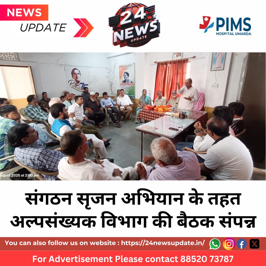 24 News Update उदयपुर। राजस्थान प्रदेश कांग्रेस अल्पसंख्यक विभाग द्वारा संगठन सृजन अभियान के तहत उदयपुर देहात अल्पसंख्यक विभाग की बैठक सूरजपोल स्थित उदयपुर देहात जिला कांग्रेस कमेटी कार्यालय में आयोजित की गई। बैठक का संचालन अल्पसंख्यक विभाग के प्रदेश प्रभारी मोहम्मद इकबाल काजी एवं सह प्रभारी सैयद अकरम अली ने किया। बैठक में आगामी समय में संगठन सृजन अभियान के अंतर्गत उदयपुर देहात जिला कांग्रेस अल्पसंख्यक विभाग में पदाधिकारियों की नियुक्ति करने पर चर्चा की गई। इस अवसर पर उदयपुर देहात जिला कांग्रेस अध्यक्ष कचरू लाल चौधरी, पूर्व विधायक प्रीति शक्तावत, पूर्व राज्य मंत्री असरार अहमद सहित कई पदाधिकारी और कार्यकर्ता उपस्थित रहे। यह जानकारी डॉ. संजीव राजपुरोहित, प्रवक्ता, उदयपुर देहात जिला कांग्रेस कमेटी ने दी।