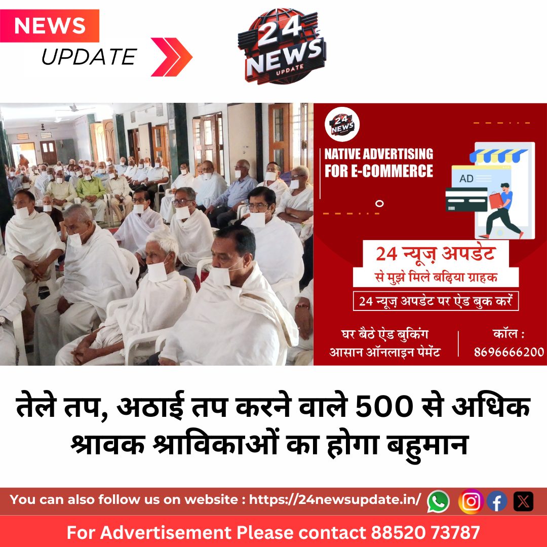 24 News Update उदयपुर। श्री वर्धमान जैन श्रावक समिति हिरण मगरी सेक्टर 3 में आयोजित चातुर्मास के तहत भव्य सामूहिक तेले तप पारणा दिवस एवं बहुमान समारोह का आयोजन बुधवार को होगा। सेक्टर 4 स्थित विद्या निकेतन स्कूल में सुबह 7 बजे से आयोजित समारोह में तप करने वाले 500 से अधिक श्रावक श्राविकाओं का बहुमान किया जाएगा।